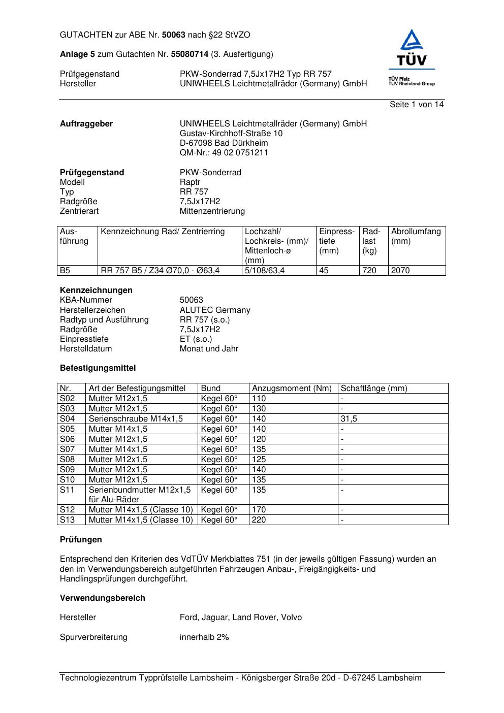 Dieses Gutachten (abe) bezieht sich auf die Alufelge ALUTEC RR 757 in der Ausführung 7.5Jx17 ET 0, Mittenloch 0 mm (KBA 50063). Im PDF findest du typischerweise zulässige Reifengrößen, Auflagen/Anbauhinweise und – je nach Dokument – Hinweise zur Eintragung.