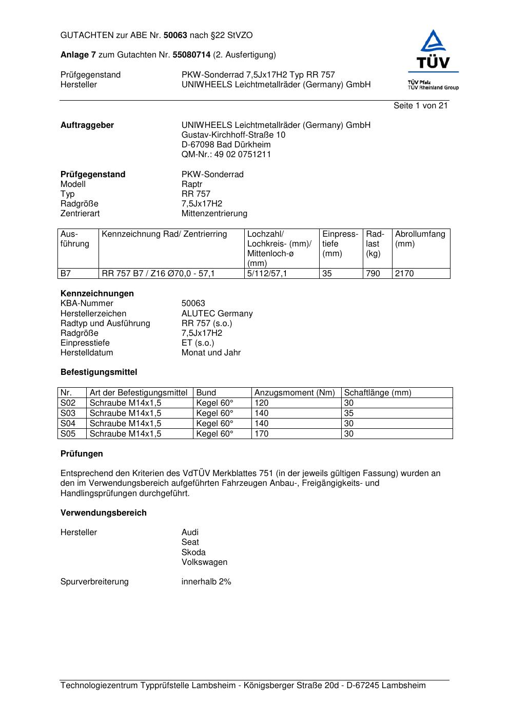 Dieses Gutachten (abe) bezieht sich auf die Alufelge ALUTEC RR 757 in der Ausführung 7.5Jx17 ET 0, Mittenloch 0 mm (KBA 50063). Im PDF findest du typischerweise zulässige Reifengrößen, Auflagen/Anbauhinweise und – je nach Dokument – Hinweise zur Eintragung.