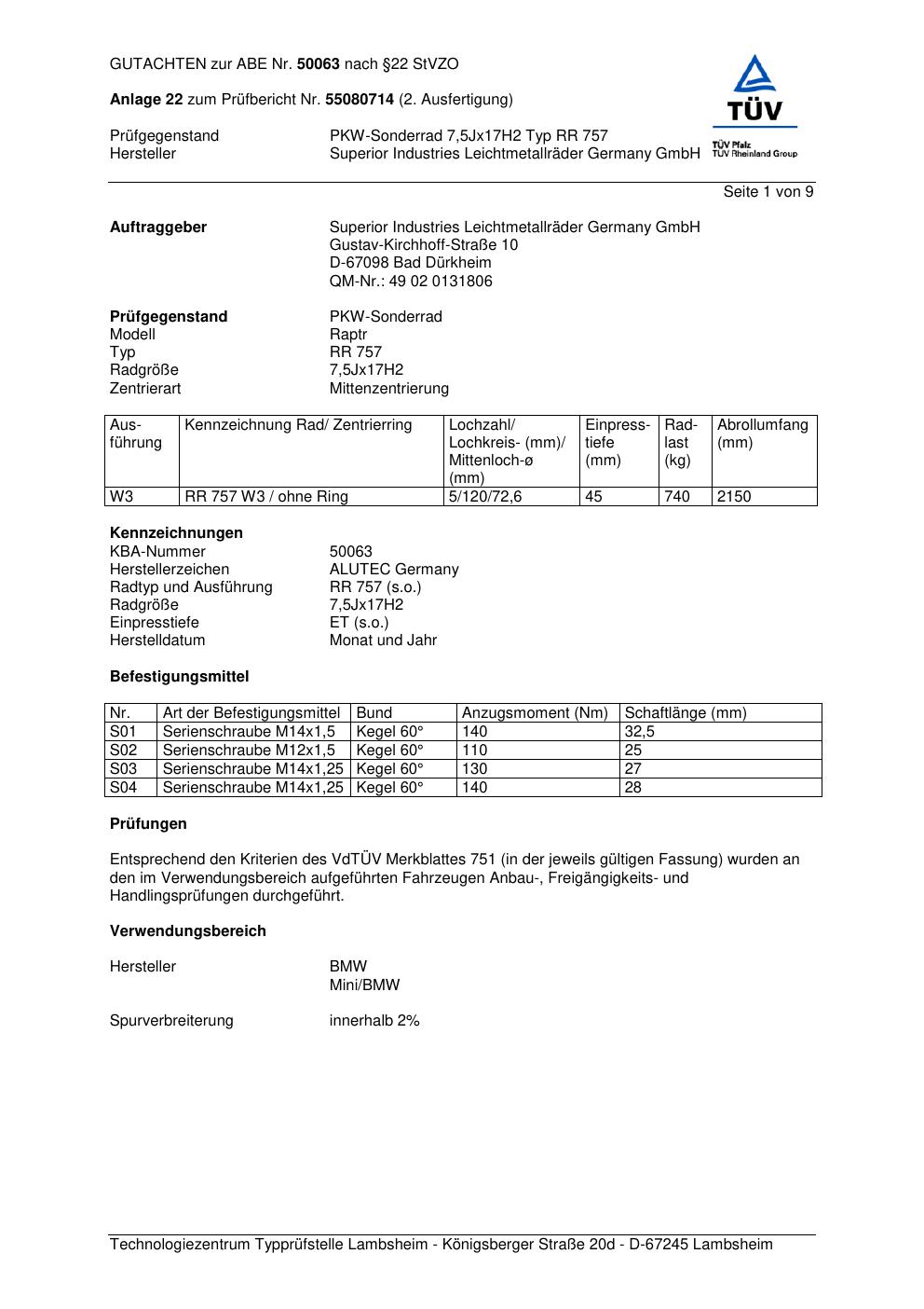 Dieses Gutachten (abe) bezieht sich auf die Alufelge ALUTEC RR 757 in der Ausführung 7.5Jx17 ET 0, Mittenloch 0 mm (KBA 50063). Im PDF findest du typischerweise zulässige Reifengrößen, Auflagen/Anbauhinweise und – je nach Dokument – Hinweise zur Eintragung.