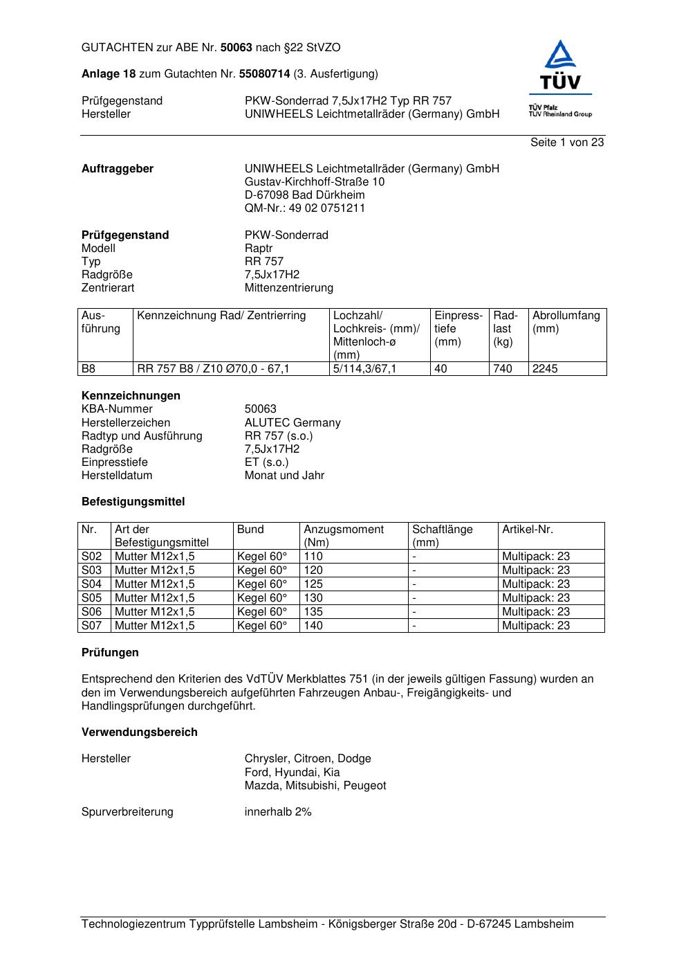 Dieses Gutachten (abe) bezieht sich auf die Alufelge ALUTEC RR 757 in der Ausführung 7.5Jx17 ET 0, Mittenloch 0 mm (KBA 50063). Im PDF findest du typischerweise zulässige Reifengrößen, Auflagen/Anbauhinweise und – je nach Dokument – Hinweise zur Eintragung.