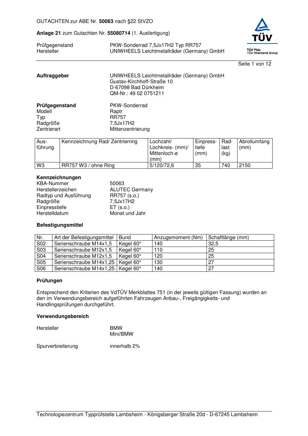 Dieses Gutachten (abe) bezieht sich auf die Alufelge ALUTEC RR757 in der Ausführung 7.5Jx17 ET 0, Mittenloch 0 mm (KBA 50063). Im PDF findest du typischerweise zulässige Reifengrößen, Auflagen/Anbauhinweise und – je nach Dokument – Hinweise zur Eintragung.