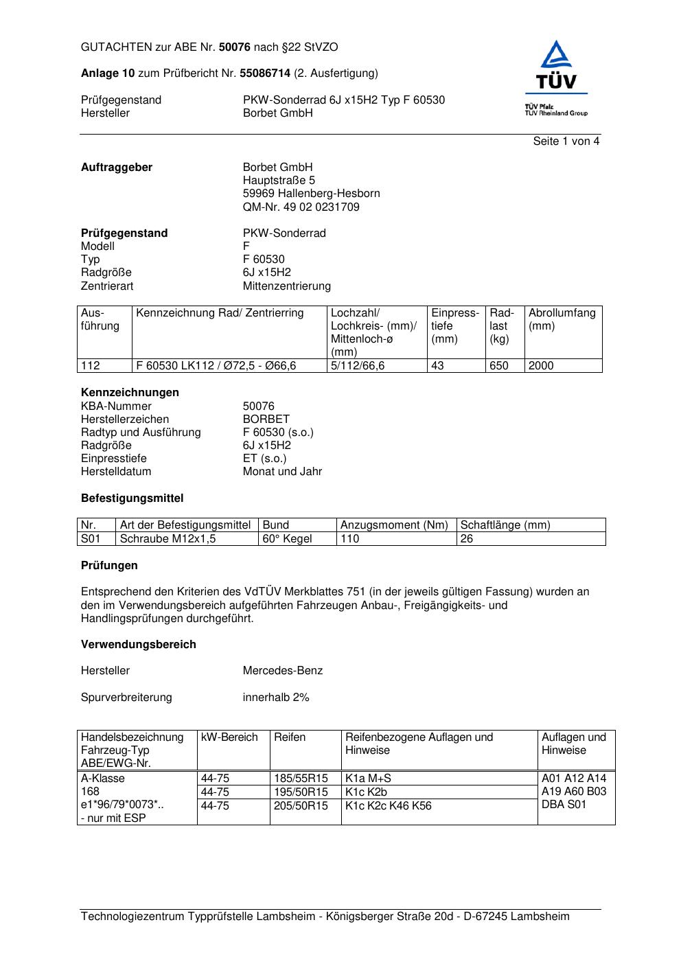 Dieses Gutachten (abe) bezieht sich auf die Alufelge Borbet F 60530 in der Ausführung 6Jx15 ET 0, Mittenloch 0 mm (KBA 50076). Im PDF findest du typischerweise zulässige Reifengrößen, Auflagen/Anbauhinweise und – je nach Dokument – Hinweise zur Eintragung.