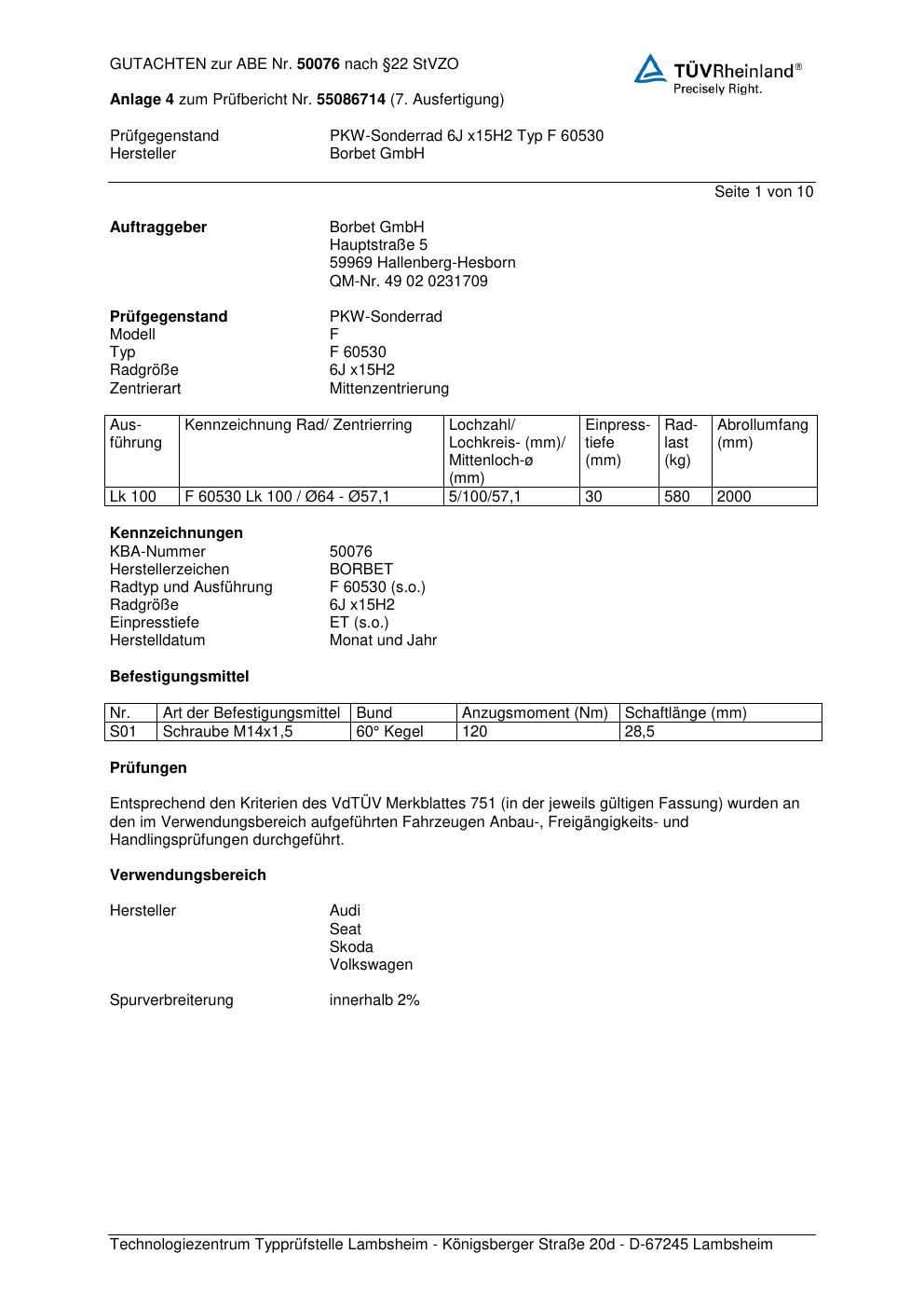 Felgengutachten / abe für Alufelgen Borbet F 60530 (6Jx15 ET 0, Mittenloch 0 mm) mit KBA 50076 (Zertifikatsnummer 50076). Hier kostenlos als PDF herunterladen. Der Download-Link ist 24 Stunden gültig und kann bis zu zwei Mal verwendet werden.