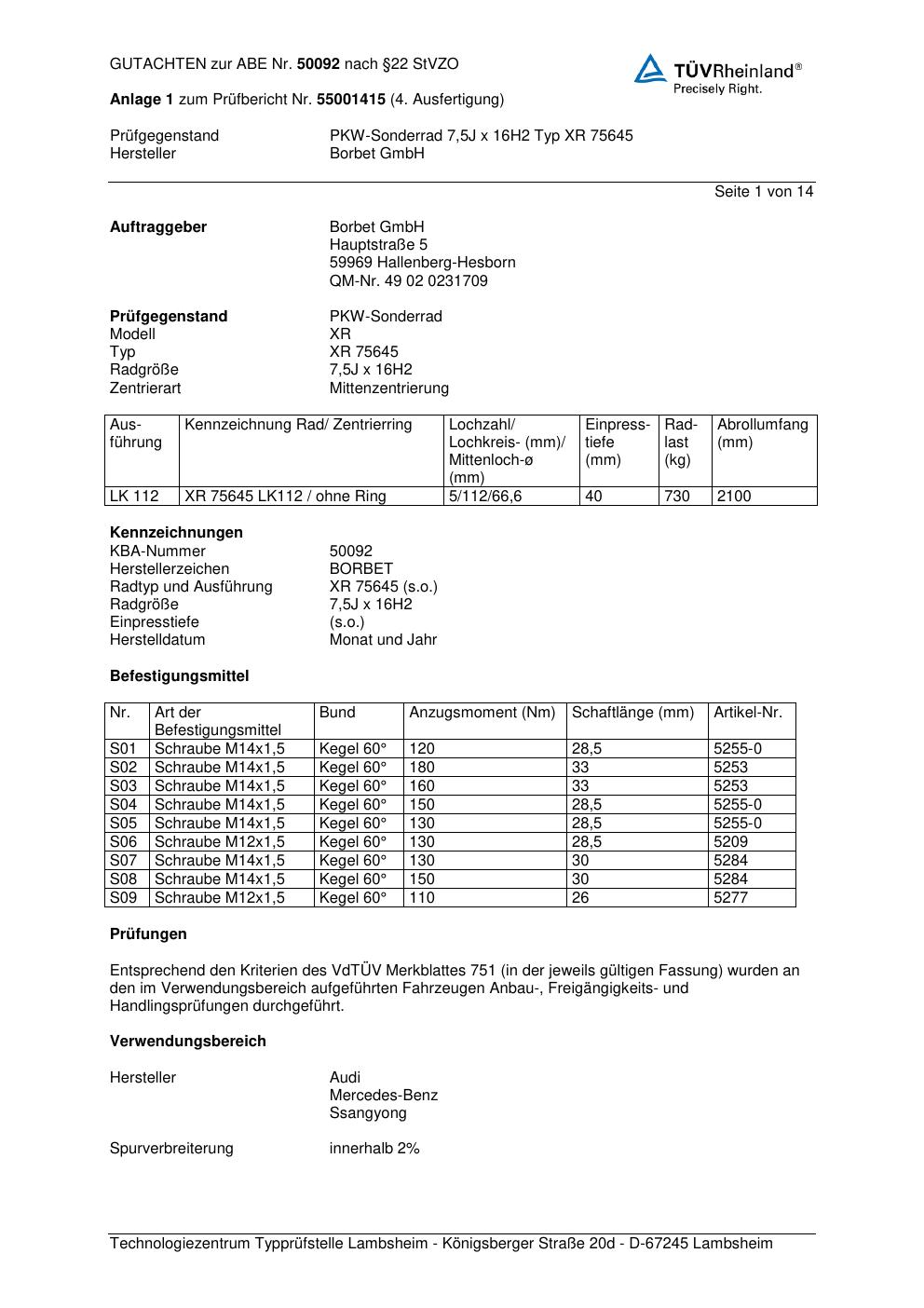 Dieses Gutachten (abe) bezieht sich auf die Alufelge Borbet XR 756 45 in der Ausführung 7.5Jx16 ET 0, Mittenloch 0 mm (KBA 50092). Im PDF findest du typischerweise zulässige Reifengrößen, Auflagen/Anbauhinweise und – je nach Dokument – Hinweise zur Eintragung.