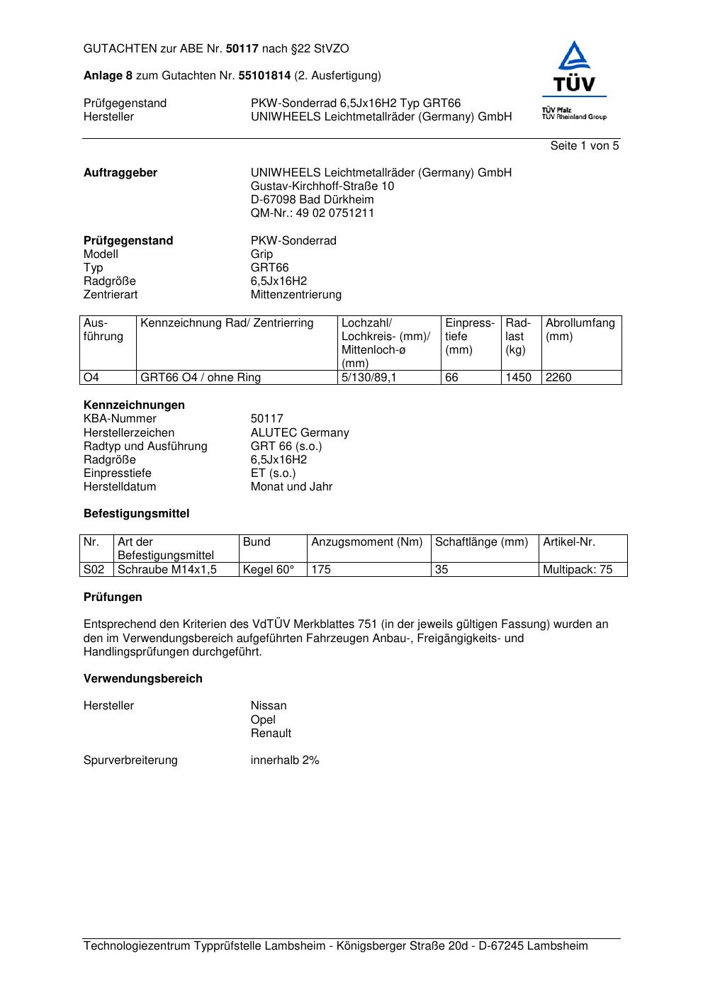 Dieses Gutachten (abe) bezieht sich auf die Alufelge ALUTEC GRT66 in der Ausführung 6.5Jx16 ET 0, Mittenloch 0 mm (KBA 50117). Im PDF findest du typischerweise zulässige Reifengrößen, Auflagen/Anbauhinweise und – je nach Dokument – Hinweise zur Eintragung.