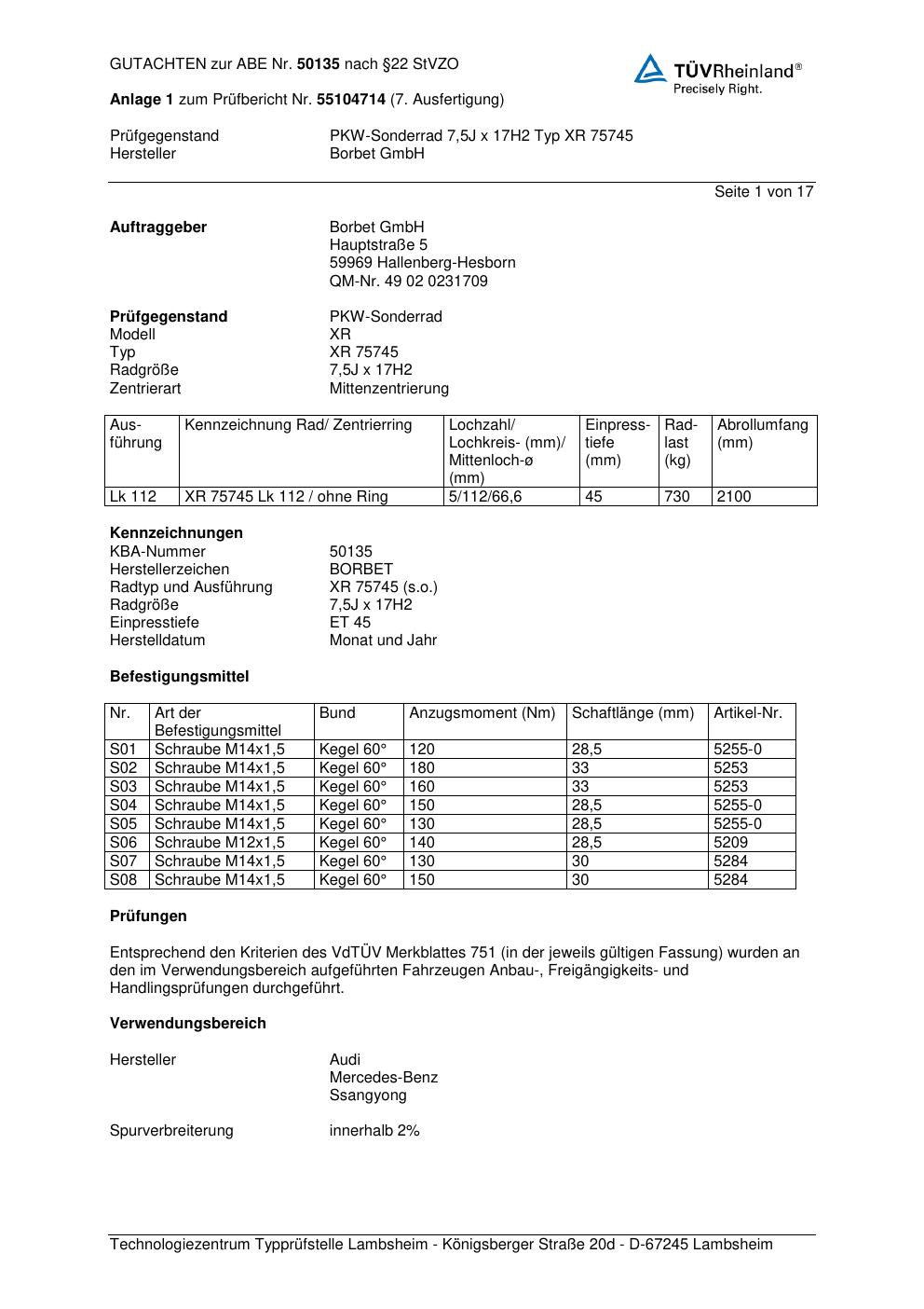 Dieses Gutachten (abe) bezieht sich auf die Alufelge Borbet XR 757 45 in der Ausführung 7.5Jx17 ET 0, Mittenloch 0 mm (KBA 50135). Im PDF findest du typischerweise zulässige Reifengrößen, Auflagen/Anbauhinweise und – je nach Dokument – Hinweise zur Eintragung.