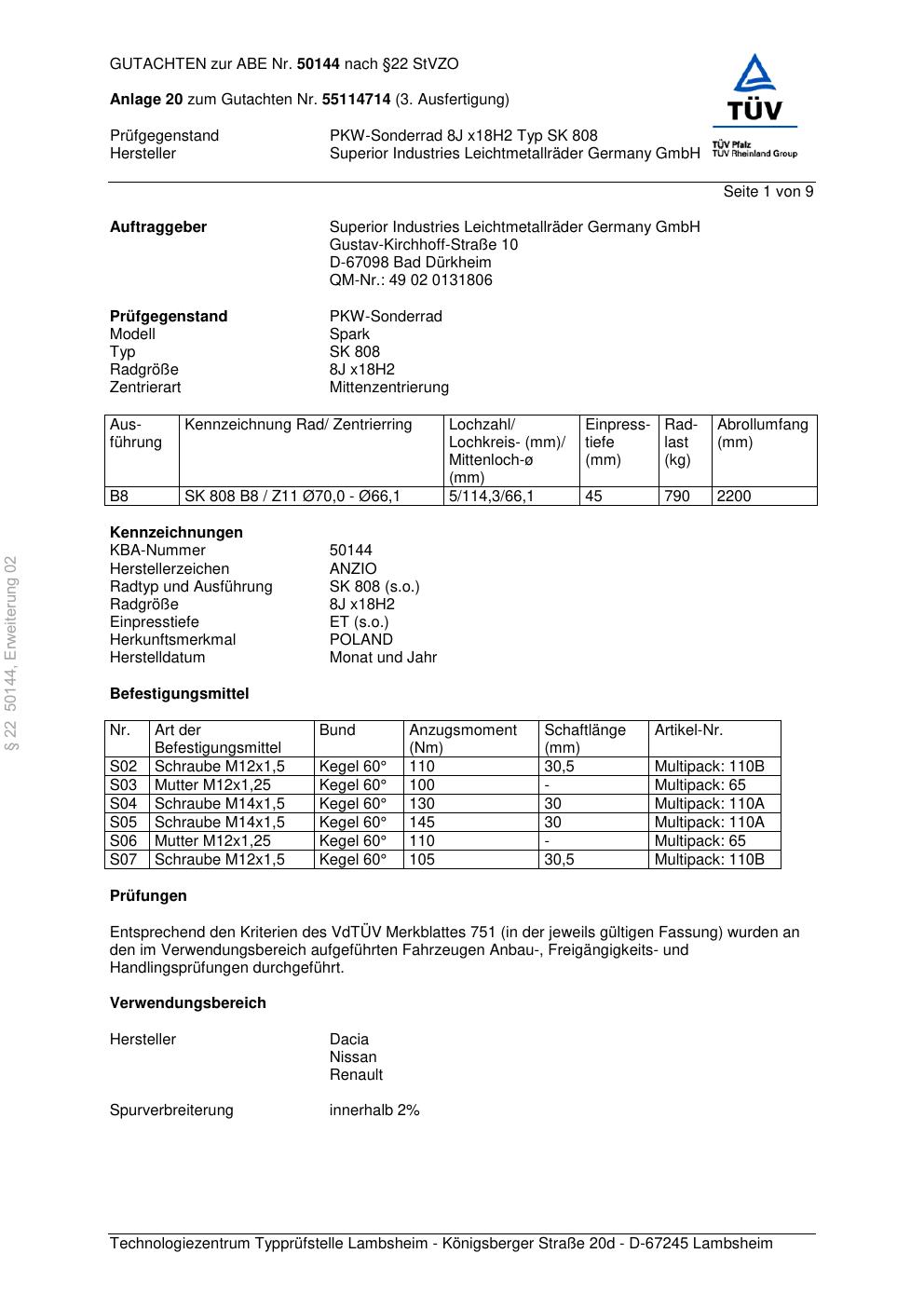 Dieses Gutachten (abe) bezieht sich auf die Alufelge brand-anzio SK 808 in der Ausführung 8Jx18 ET 0, Mittenloch 0 mm (KBA 50144). Im PDF findest du typischerweise zulässige Reifengrößen, Auflagen/Anbauhinweise und – je nach Dokument – Hinweise zur Eintragung.