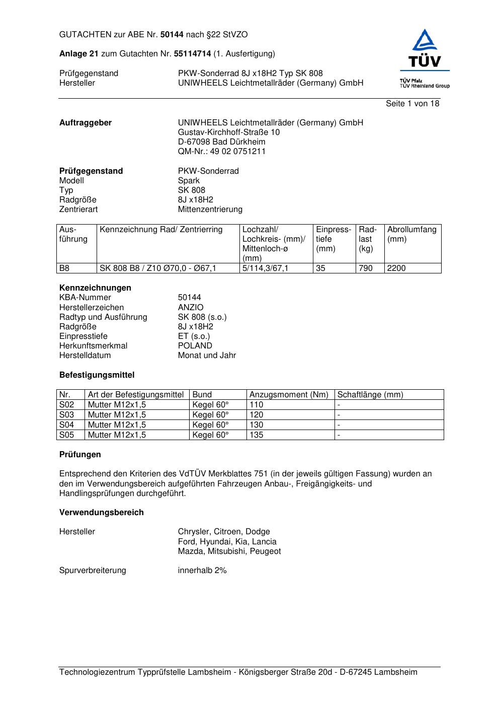 Dieses Gutachten (abe) bezieht sich auf die Alufelge brand-anzio SK 808 in der Ausführung 8Jx18 ET 0, Mittenloch 0 mm (KBA 50144). Im PDF findest du typischerweise zulässige Reifengrößen, Auflagen/Anbauhinweise und – je nach Dokument – Hinweise zur Eintragung.