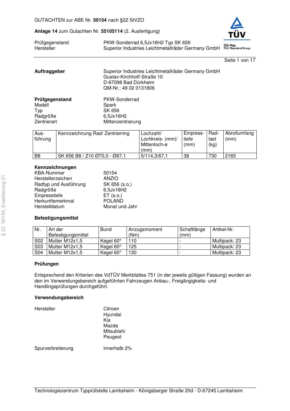 Dieses Gutachten (abe) bezieht sich auf die Alufelge brand-anzio SK 656 in der Ausführung 6.5Jx16 ET 0, Mittenloch 0 mm (KBA 50154). Im PDF findest du typischerweise zulässige Reifengrößen, Auflagen/Anbauhinweise und – je nach Dokument – Hinweise zur Eintragung.