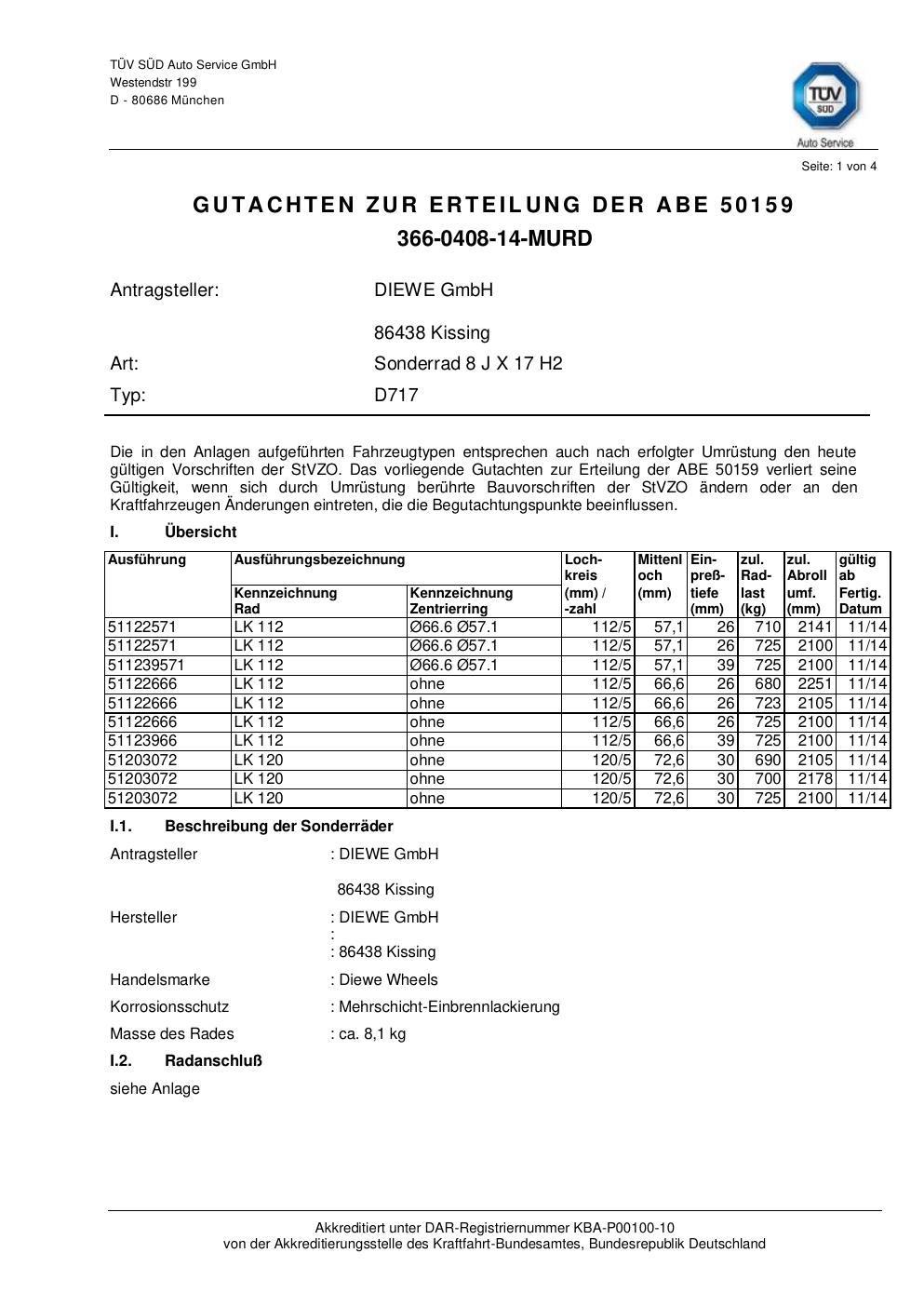 Dieses Gutachten (abe) bezieht sich auf die Alufelge Diewe D717 in der Ausführung 8Jx17 ET 0, Mittenloch 0 mm (KBA 50159). Im PDF findest du typischerweise zulässige Reifengrößen, Auflagen/Anbauhinweise und – je nach Dokument – Hinweise zur Eintragung.