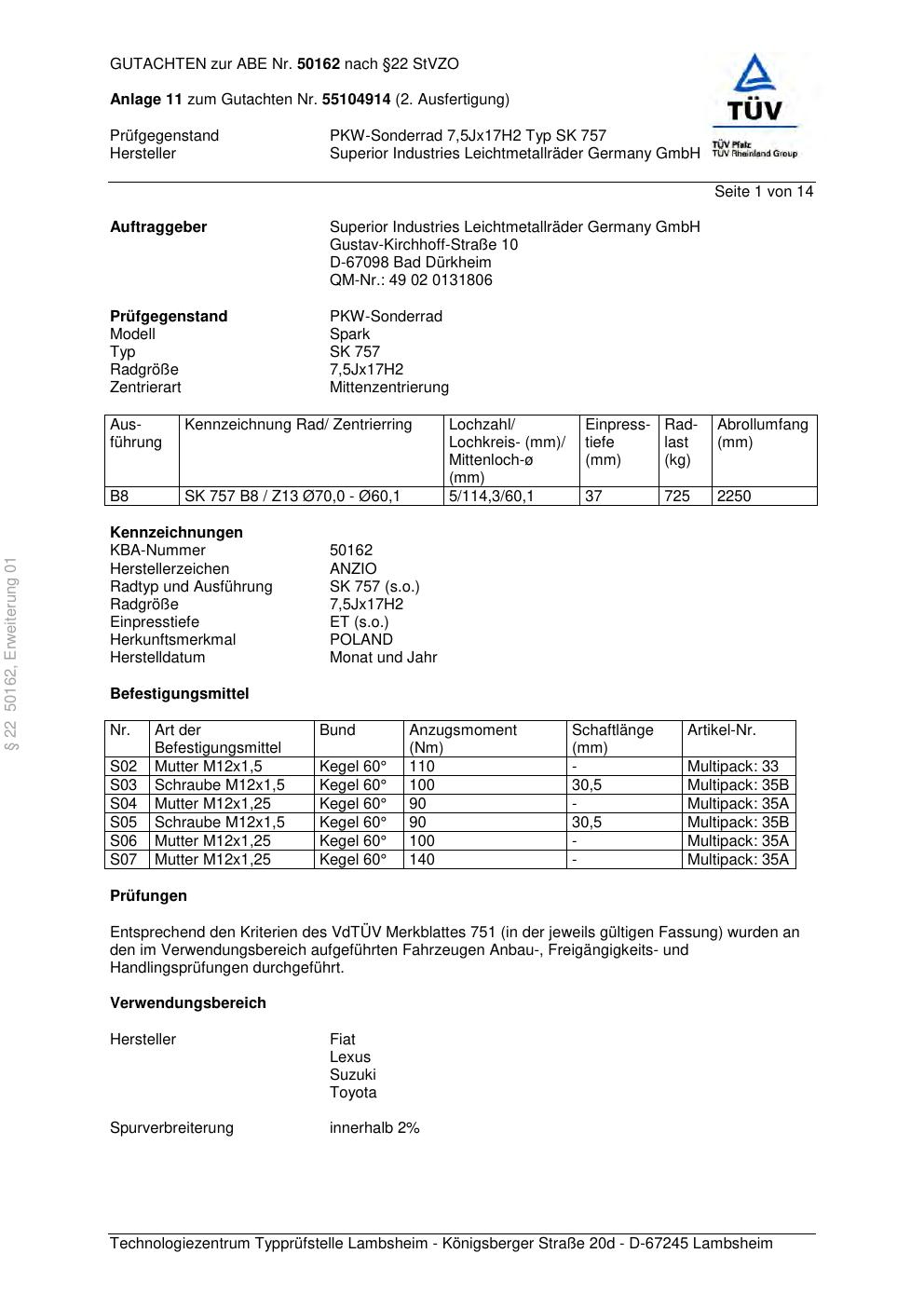 Dieses Gutachten (abe) bezieht sich auf die Alufelge brand-anzio SK 757 in der Ausführung 7.5Jx17 ET 0, Mittenloch 0 mm (KBA 50162). Im PDF findest du typischerweise zulässige Reifengrößen, Auflagen/Anbauhinweise und – je nach Dokument – Hinweise zur Eintragung.