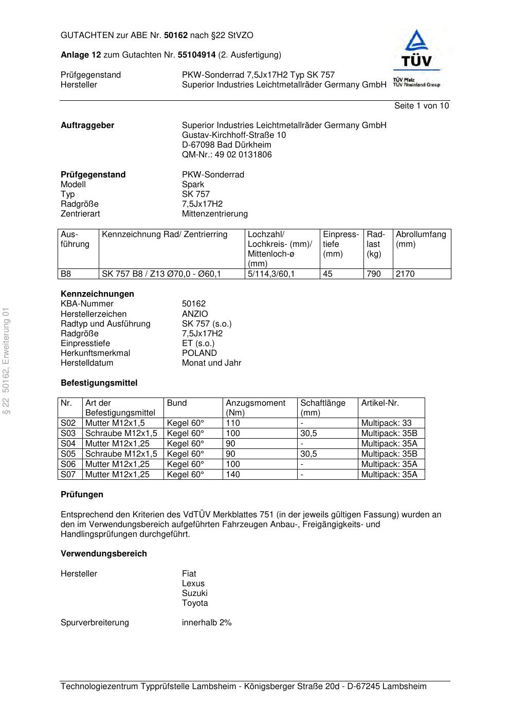 Dieses Gutachten (abe) bezieht sich auf die Alufelge brand-anzio SK 757 in der Ausführung 7.5Jx17 ET 0, Mittenloch 0 mm (KBA 50162). Im PDF findest du typischerweise zulässige Reifengrößen, Auflagen/Anbauhinweise und – je nach Dokument – Hinweise zur Eintragung.