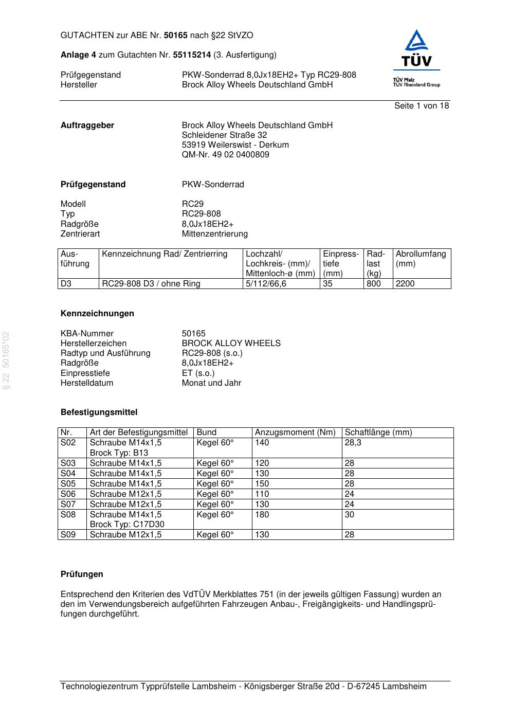 Dieses Gutachten (abe) bezieht sich auf die Alufelge Brock RC29-8 08 in der Ausführung ET 0, Mittenloch 0 mm (KBA 50165). Im PDF findest du typischerweise zulässige Reifengrößen, Auflagen/Anbauhinweise und – je nach Dokument – Hinweise zur Eintragung.