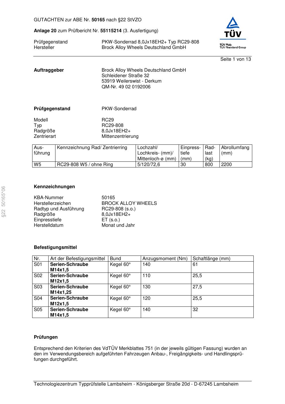 Dieses Gutachten (abe) bezieht sich auf die Alufelge Brock RC29-8 08 in der Ausführung ET 0, Mittenloch 0 mm (KBA 50165). Im PDF findest du typischerweise zulässige Reifengrößen, Auflagen/Anbauhinweise und – je nach Dokument – Hinweise zur Eintragung.