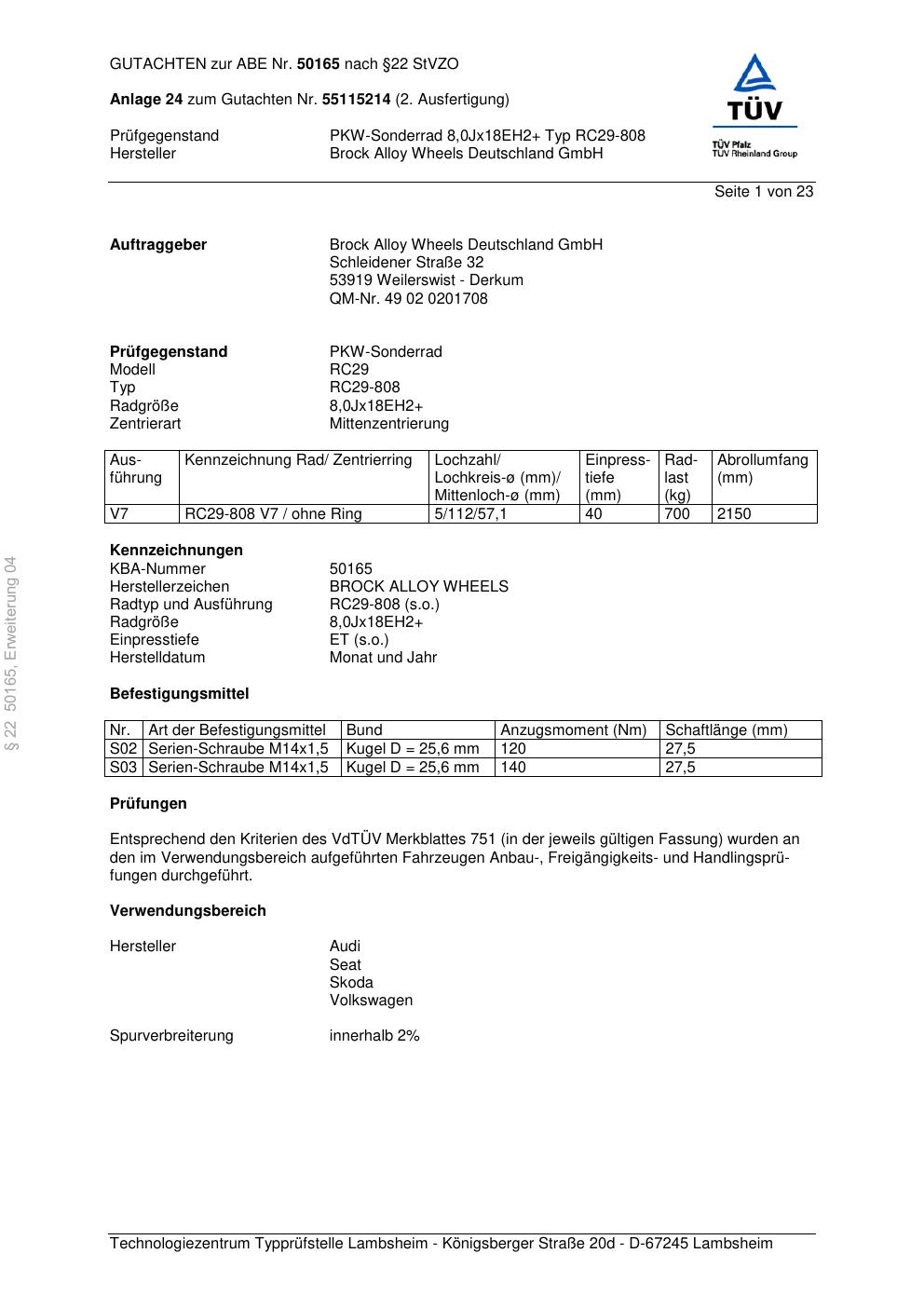 Dieses Gutachten (abe) bezieht sich auf die Alufelge Brock RC29-8 08 in der Ausführung ET 0, Mittenloch 0 mm (KBA 50165). Im PDF findest du typischerweise zulässige Reifengrößen, Auflagen/Anbauhinweise und – je nach Dokument – Hinweise zur Eintragung.