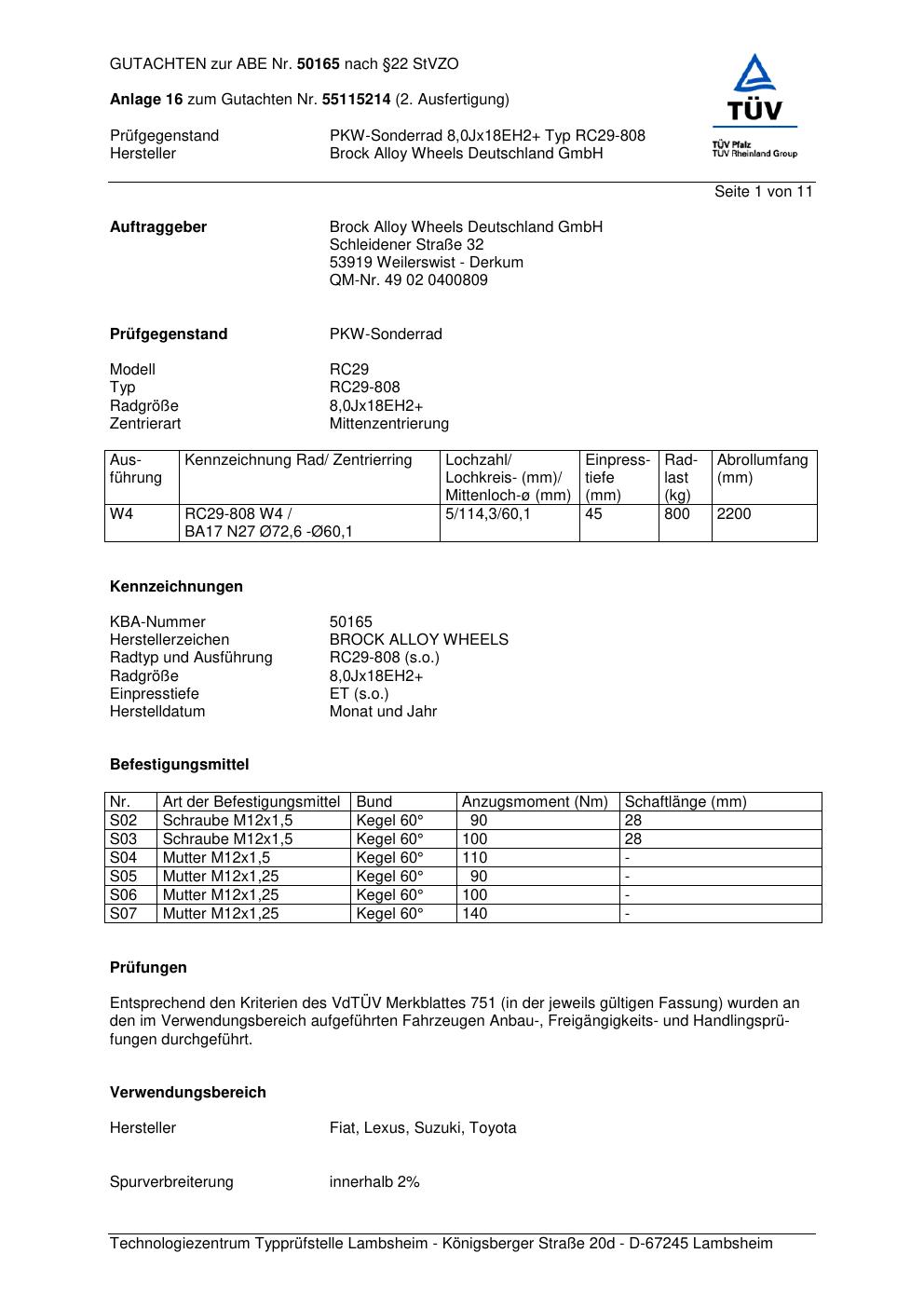Dieses Gutachten (abe) bezieht sich auf die Alufelge Brock RC29-8 08 in der Ausführung 8Jx18 ET 0, Mittenloch 0 mm (KBA 50165). Im PDF findest du typischerweise zulässige Reifengrößen, Auflagen/Anbauhinweise und – je nach Dokument – Hinweise zur Eintragung.