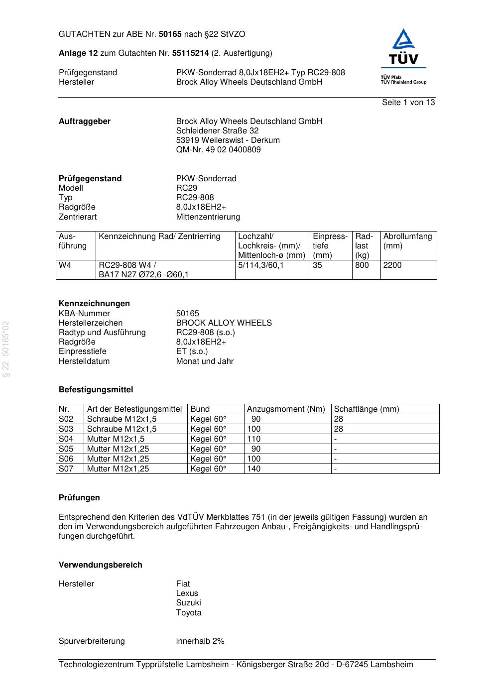 Dieses Gutachten (abe) bezieht sich auf die Alufelge Brock RC29-8 08 in der Ausführung ET 0, Mittenloch 0 mm (KBA 50165). Im PDF findest du typischerweise zulässige Reifengrößen, Auflagen/Anbauhinweise und – je nach Dokument – Hinweise zur Eintragung.