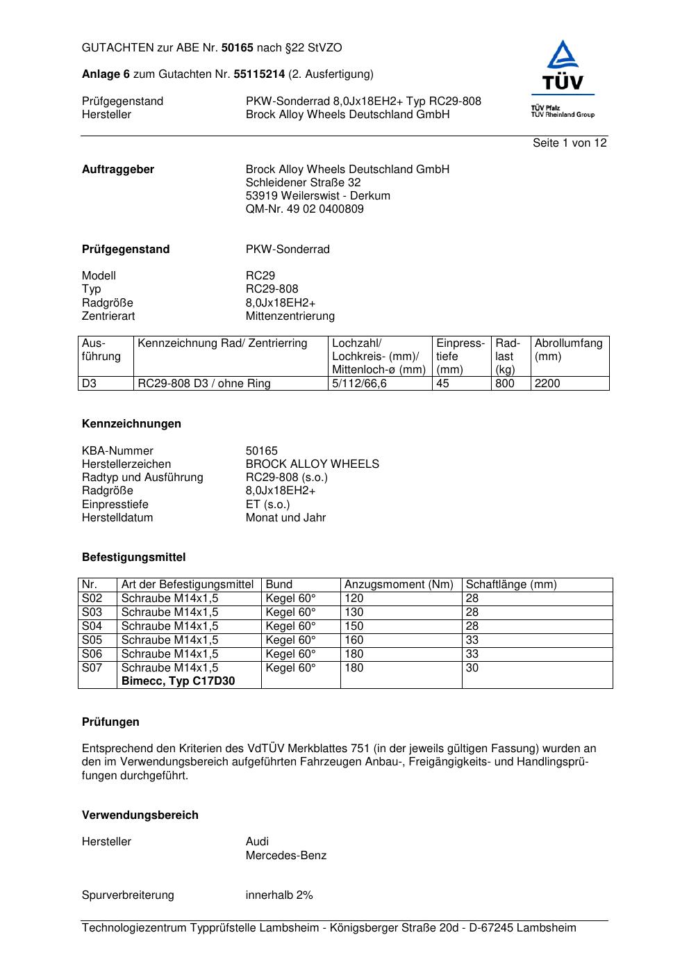 Dieses Gutachten (abe) bezieht sich auf die Alufelge Brock RC29-8 08 in der Ausführung 8Jx18 ET 0, Mittenloch 0 mm (KBA 50165). Im PDF findest du typischerweise zulässige Reifengrößen, Auflagen/Anbauhinweise und – je nach Dokument – Hinweise zur Eintragung.