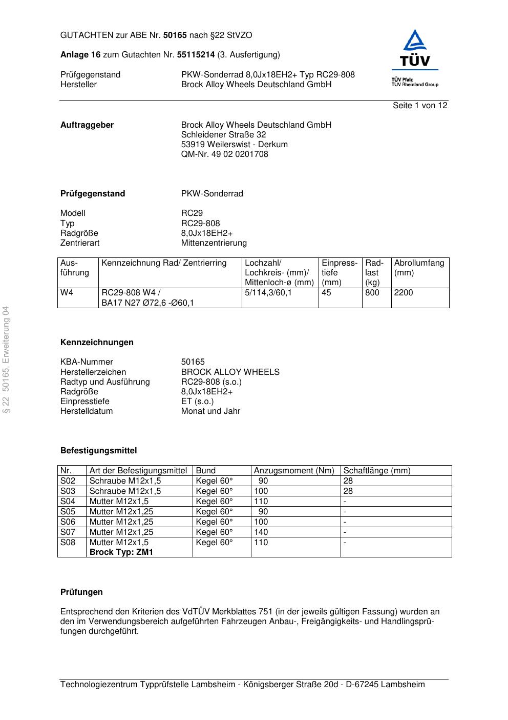 Dieses Gutachten (abe) bezieht sich auf die Alufelge Brock RC29-8 08 in der Ausführung ET 0, Mittenloch 0 mm (KBA 50165). Im PDF findest du typischerweise zulässige Reifengrößen, Auflagen/Anbauhinweise und – je nach Dokument – Hinweise zur Eintragung.
