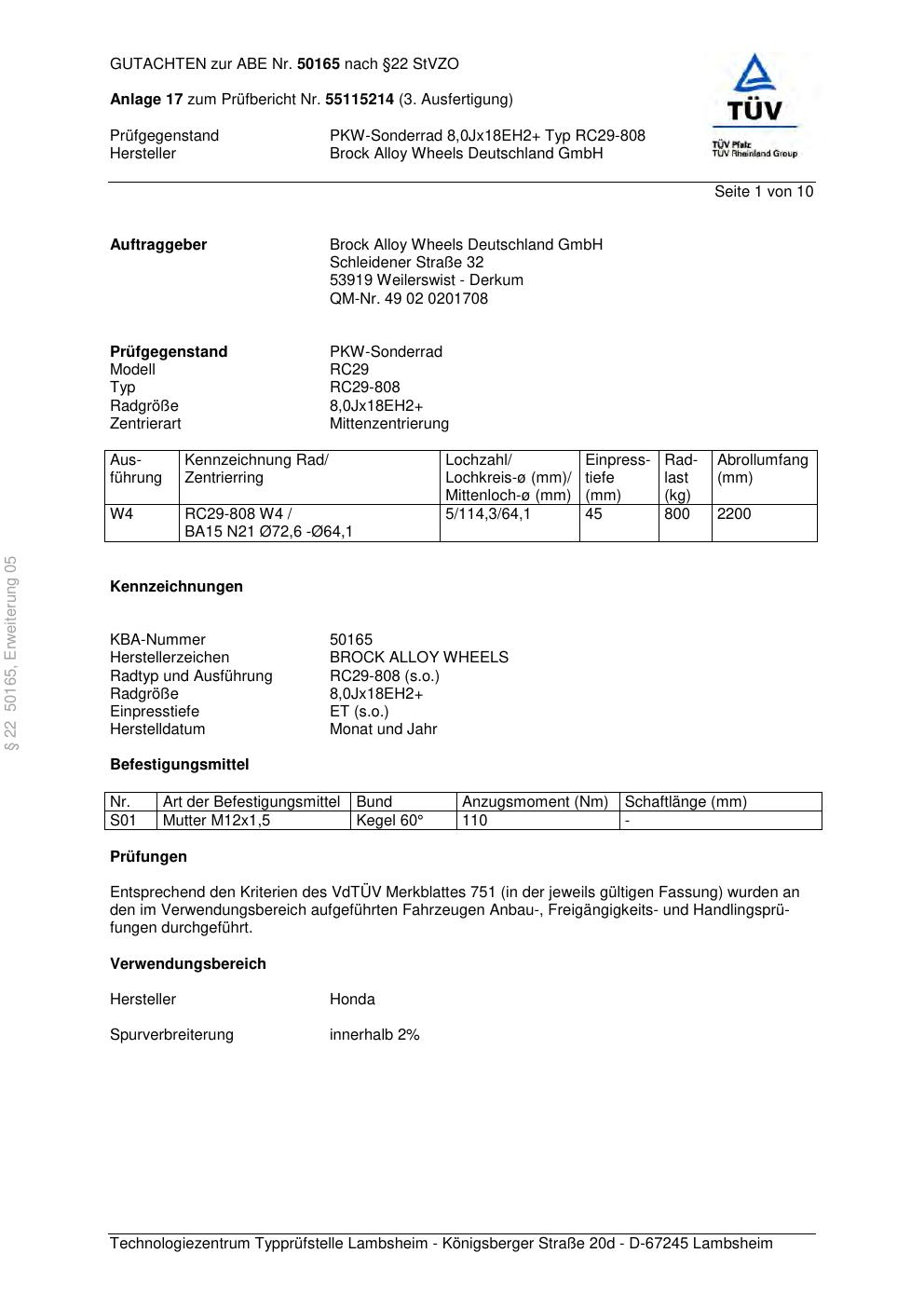 Dieses Gutachten (abe) bezieht sich auf die Alufelge Brock RC29-808 in der Ausführung ET 0, Mittenloch 0 mm (KBA 50165). Im PDF findest du typischerweise zulässige Reifengrößen, Auflagen/Anbauhinweise und – je nach Dokument – Hinweise zur Eintragung.