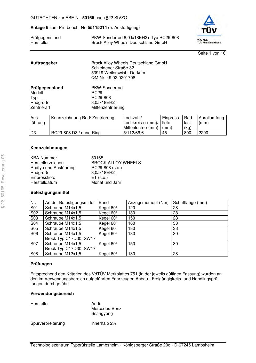 Dieses Gutachten (abe) bezieht sich auf die Alufelge Brock RC29-808 in der Ausführung ET 0, Mittenloch 0 mm (KBA 50165). Im PDF findest du typischerweise zulässige Reifengrößen, Auflagen/Anbauhinweise und – je nach Dokument – Hinweise zur Eintragung.