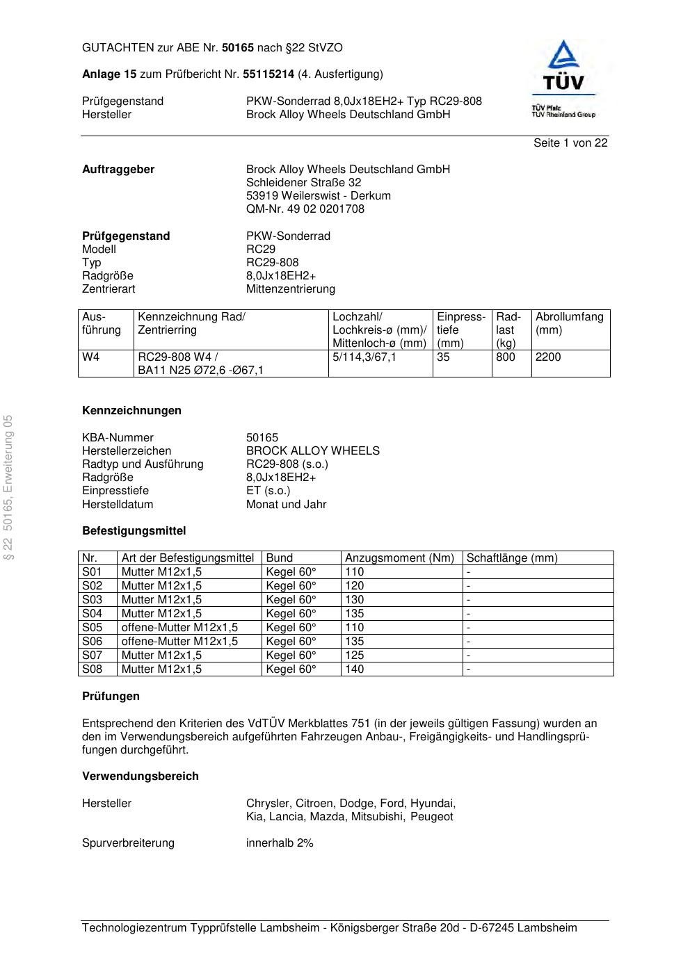Dieses Gutachten (abe) bezieht sich auf die Alufelge Brock RC29-808 in der Ausführung ET 0, Mittenloch 0 mm (KBA 50165). Im PDF findest du typischerweise zulässige Reifengrößen, Auflagen/Anbauhinweise und – je nach Dokument – Hinweise zur Eintragung.