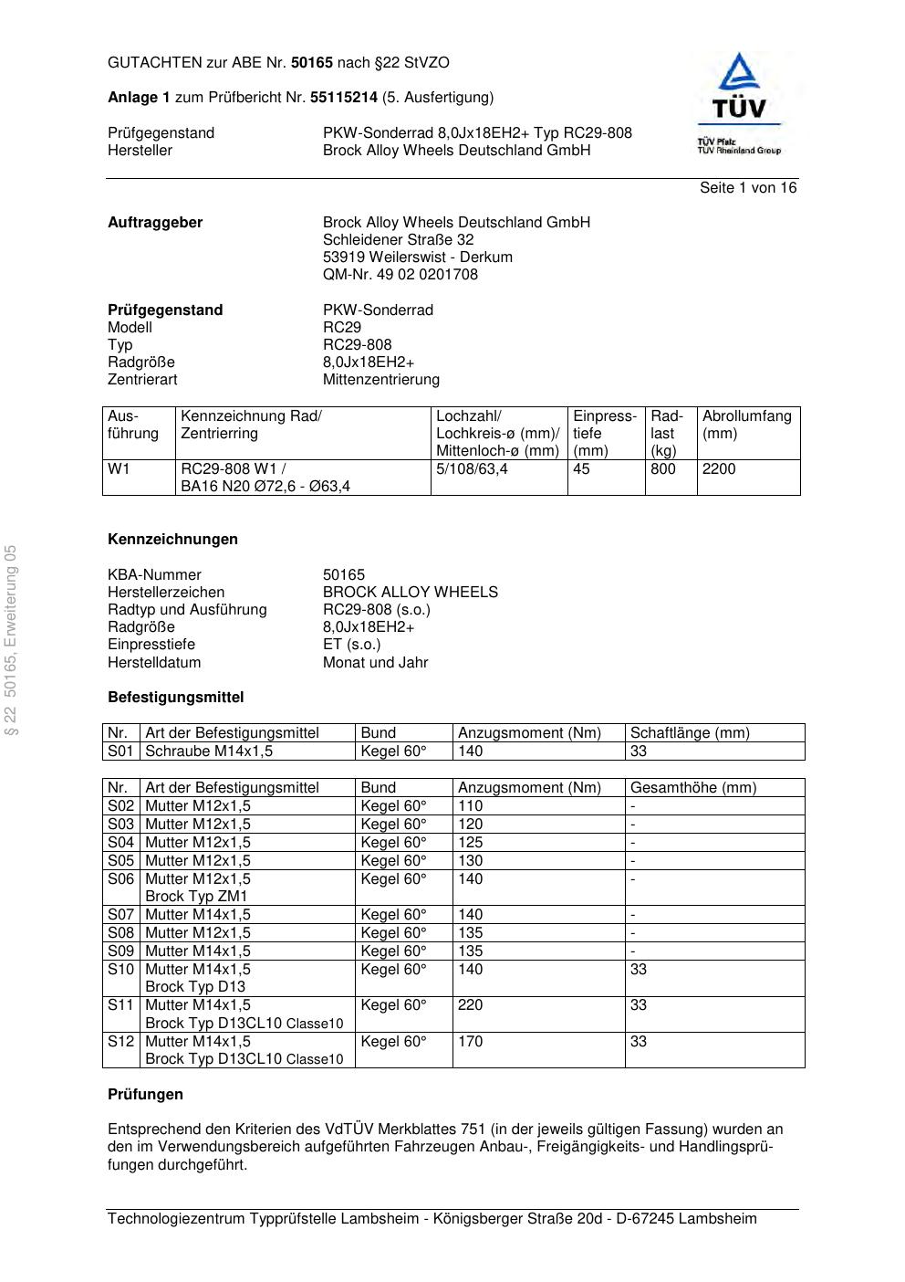 Dieses Gutachten (abe) bezieht sich auf die Alufelge Brock RC29-808 in der Ausführung ET 0, Mittenloch 0 mm (KBA 50165). Im PDF findest du typischerweise zulässige Reifengrößen, Auflagen/Anbauhinweise und – je nach Dokument – Hinweise zur Eintragung.