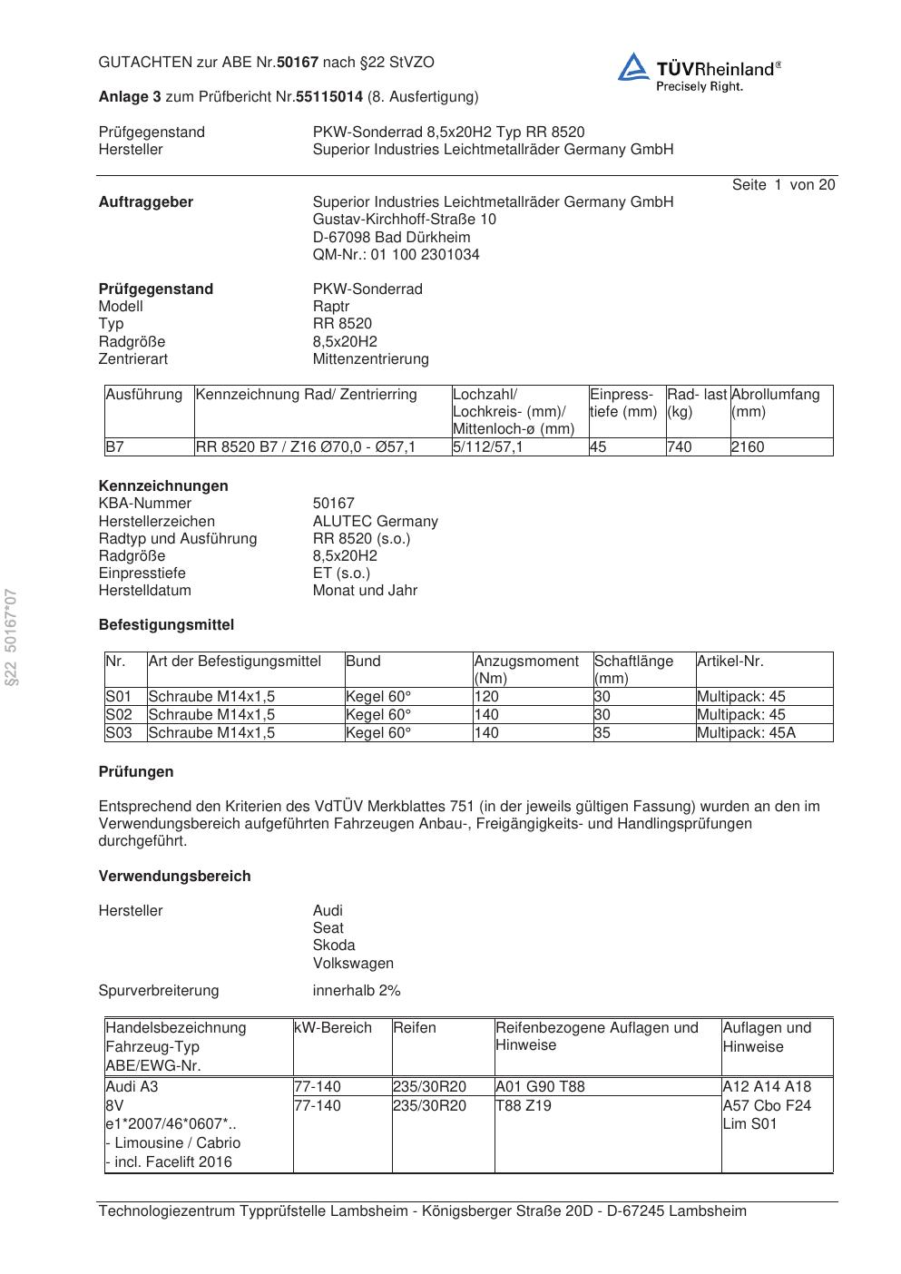 Dieses Gutachten (abe) bezieht sich auf die Alufelge ALUTEC RR 8520 in der Ausführung 8.5Jx2 ET 0, Mittenloch 0 mm (KBA 50167). Im PDF findest du typischerweise zulässige Reifengrößen, Auflagen/Anbauhinweise und – je nach Dokument – Hinweise zur Eintragung.