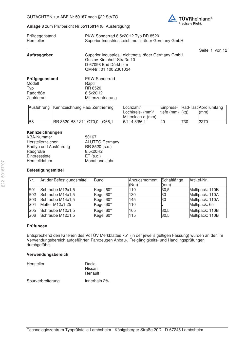 Dieses Gutachten (abe) bezieht sich auf die Alufelge ALUTEC RR 8520 in der Ausführung 8.5Jx2 ET 0, Mittenloch 0 mm (KBA 50167). Im PDF findest du typischerweise zulässige Reifengrößen, Auflagen/Anbauhinweise und – je nach Dokument – Hinweise zur Eintragung.