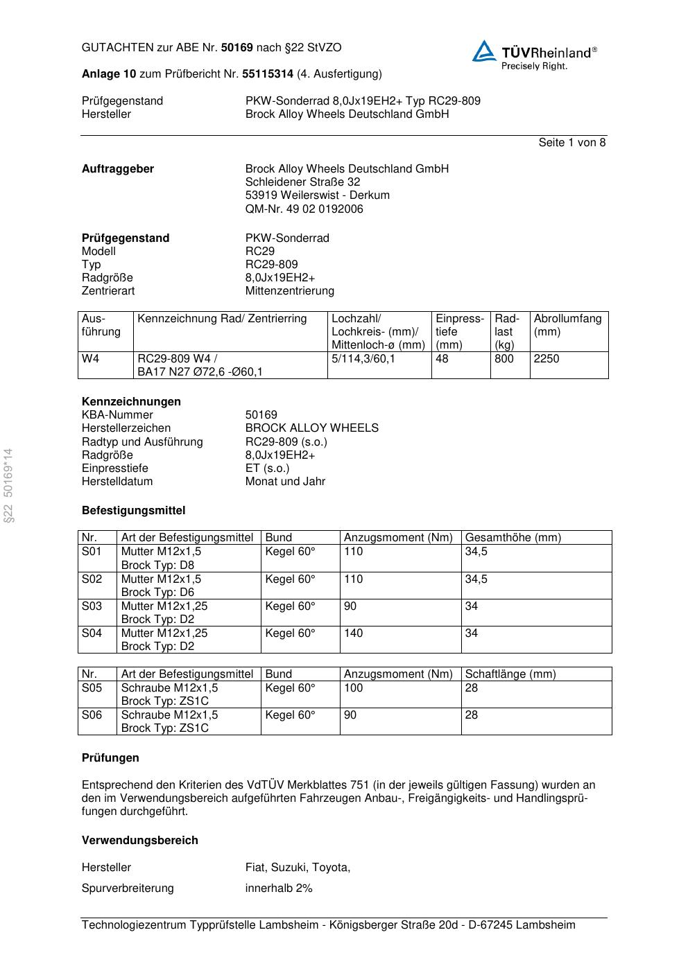 Dieses Gutachten (abe) bezieht sich auf die Alufelge Brock RC29-8 09 in der Ausführung ET 0, Mittenloch 0 mm (KBA 50169). Im PDF findest du typischerweise zulässige Reifengrößen, Auflagen/Anbauhinweise und – je nach Dokument – Hinweise zur Eintragung.