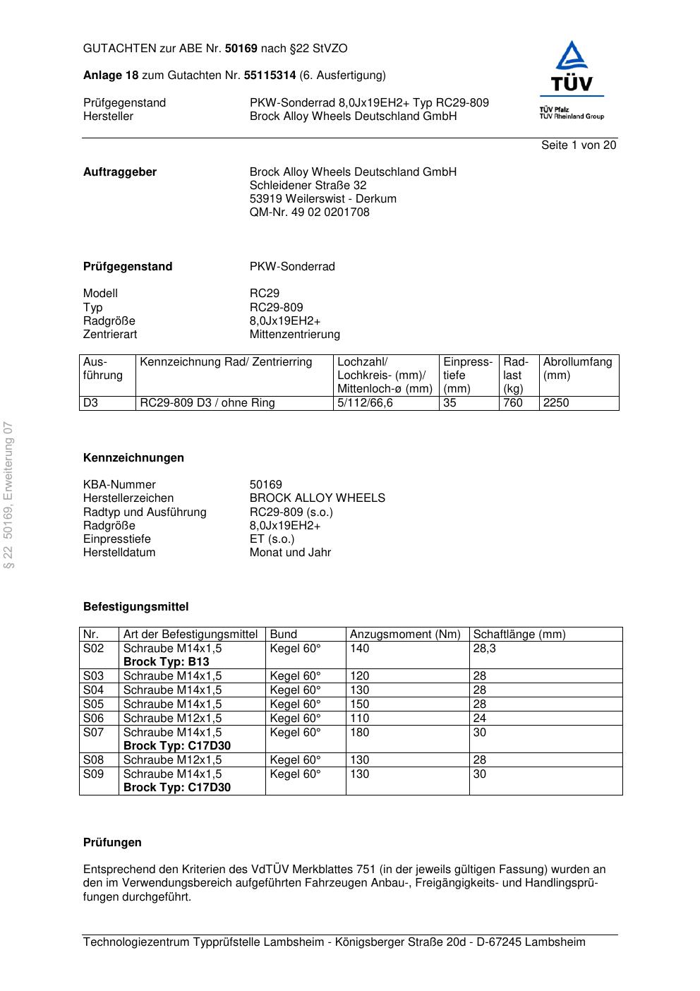 Dieses Gutachten (abe) bezieht sich auf die Alufelge Brock RC29-8 09 in der Ausführung ET 0, Mittenloch 0 mm (KBA 50169). Im PDF findest du typischerweise zulässige Reifengrößen, Auflagen/Anbauhinweise und – je nach Dokument – Hinweise zur Eintragung.