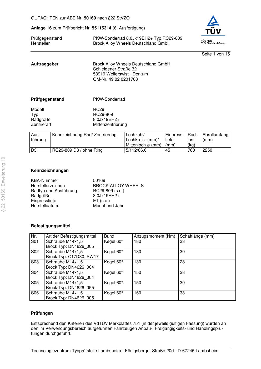 Dieses Gutachten (abe) bezieht sich auf die Alufelge Brock RC29-8 09 in der Ausführung ET 0, Mittenloch 0 mm (KBA 50169). Im PDF findest du typischerweise zulässige Reifengrößen, Auflagen/Anbauhinweise und – je nach Dokument – Hinweise zur Eintragung.