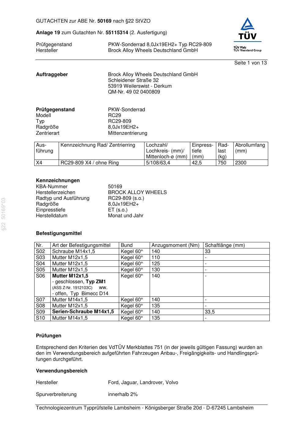 Dieses Gutachten (abe) bezieht sich auf die Alufelge Brock RC29-8 09 in der Ausführung 8Jx19 ET 0, Mittenloch 0 mm (KBA 50169). Im PDF findest du typischerweise zulässige Reifengrößen, Auflagen/Anbauhinweise und – je nach Dokument – Hinweise zur Eintragung.