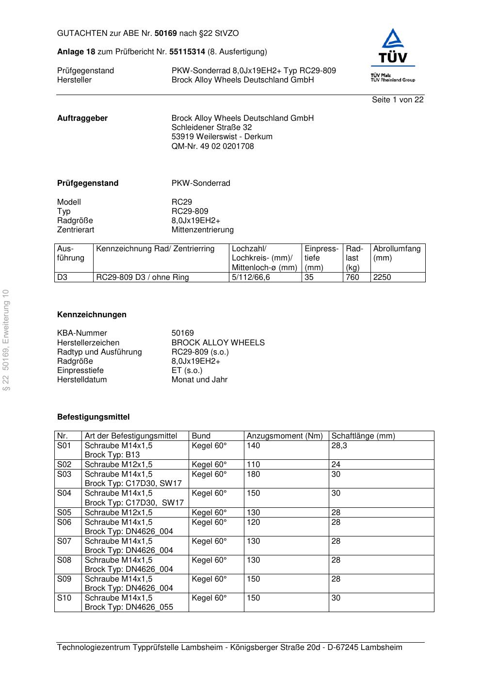 Dieses Gutachten (abe) bezieht sich auf die Alufelge Brock RC29-8 09 in der Ausführung ET 0, Mittenloch 0 mm (KBA 50169). Im PDF findest du typischerweise zulässige Reifengrößen, Auflagen/Anbauhinweise und – je nach Dokument – Hinweise zur Eintragung.