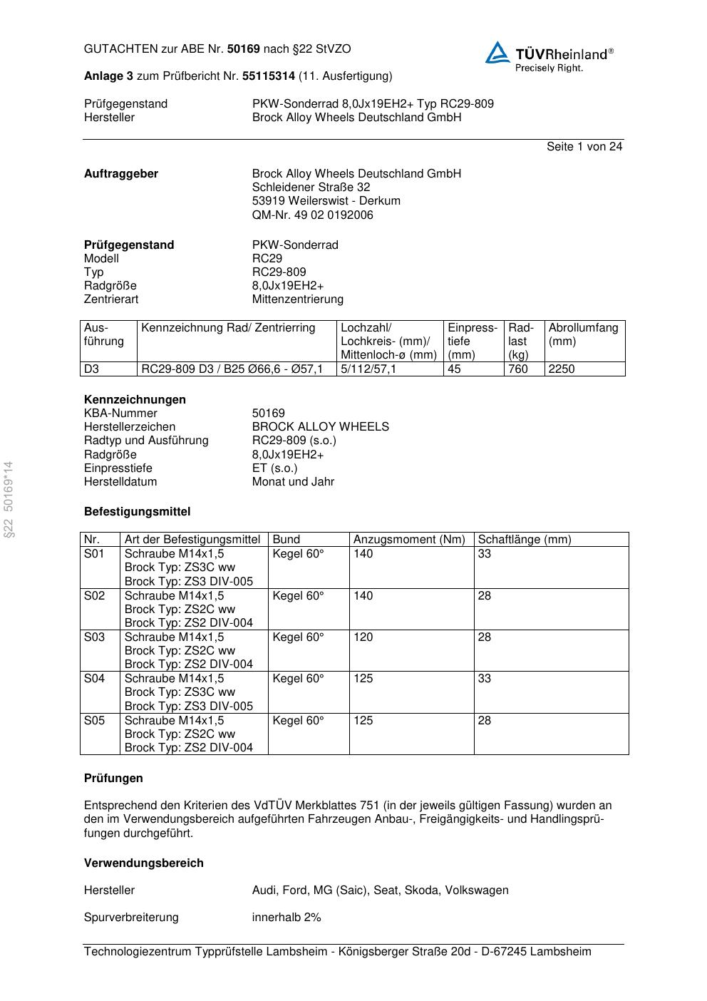 Dieses Gutachten (abe) bezieht sich auf die Alufelge Brock RC29-8 09 in der Ausführung ET 0, Mittenloch 0 mm (KBA 50169). Im PDF findest du typischerweise zulässige Reifengrößen, Auflagen/Anbauhinweise und – je nach Dokument – Hinweise zur Eintragung.