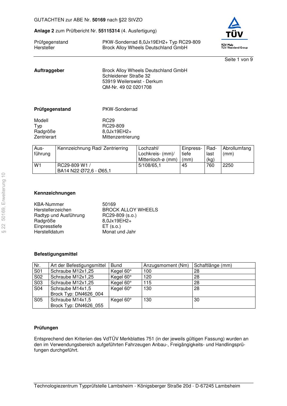 Dieses Gutachten (abe) bezieht sich auf die Alufelge Brock RC29-8 09 in der Ausführung ET 0, Mittenloch 0 mm (KBA 50169). Im PDF findest du typischerweise zulässige Reifengrößen, Auflagen/Anbauhinweise und – je nach Dokument – Hinweise zur Eintragung.