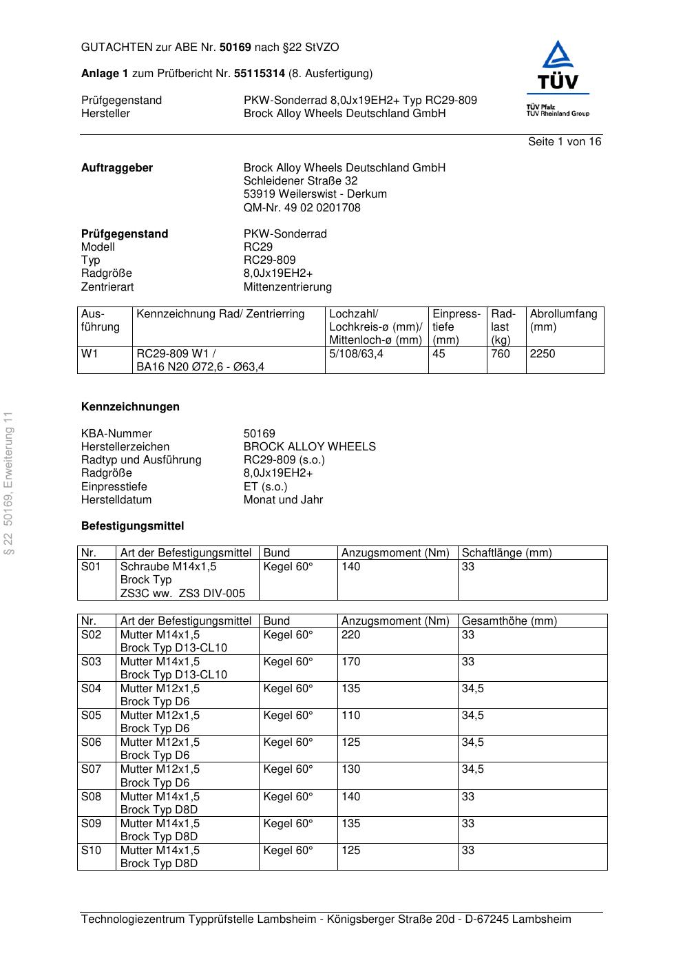 Dieses Gutachten (abe) bezieht sich auf die Alufelge Brock RC29-8 09 in der Ausführung 8.5Jx21 ET 0, Mittenloch 0 mm (KBA 50169). Im PDF findest du typischerweise zulässige Reifengrößen, Auflagen/Anbauhinweise und – je nach Dokument – Hinweise zur Eintragung.