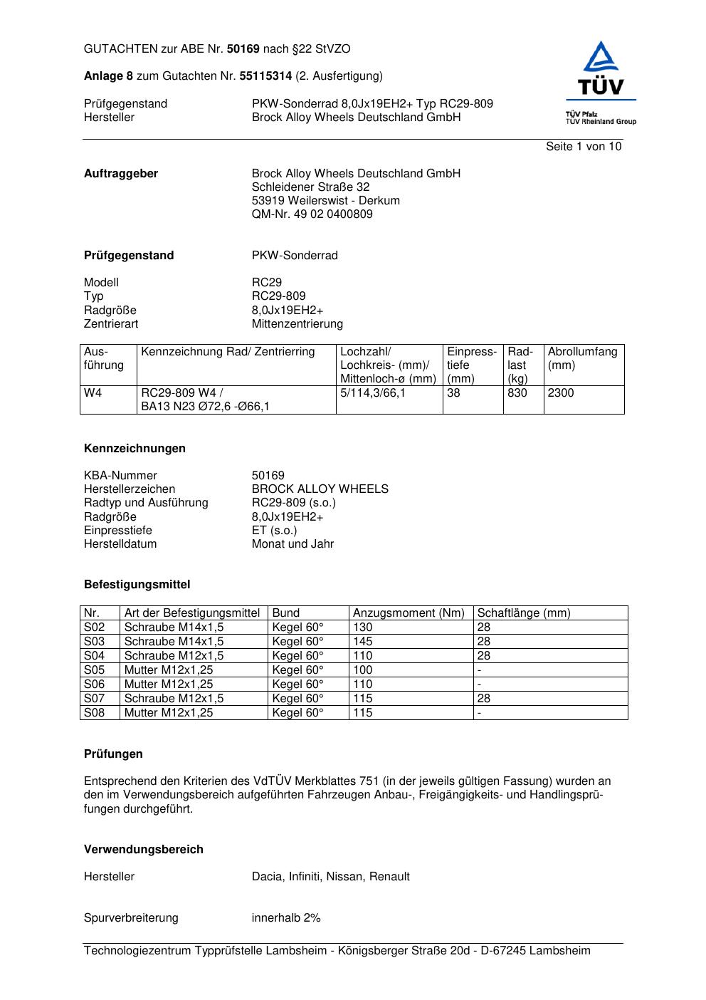 Felgengutachten / abe für Alufelgen Brock RC29-8 09 (8Jx19 ET 0, Mittenloch 0 mm) mit KBA 50169 (Zertifikatsnummer 50169). Hier kostenlos als PDF herunterladen. Der Download-Link ist 24 Stunden gültig und kann bis zu zwei Mal verwendet werden.