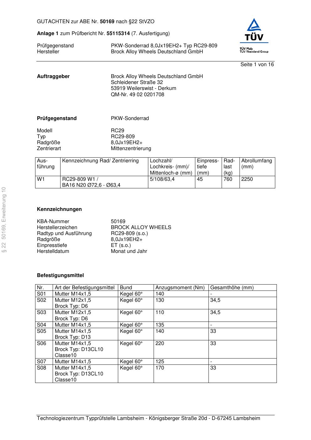 Dieses Gutachten (abe) bezieht sich auf die Alufelge Brock RC29-8 09 in der Ausführung ET 0, Mittenloch 0 mm (KBA 50169). Im PDF findest du typischerweise zulässige Reifengrößen, Auflagen/Anbauhinweise und – je nach Dokument – Hinweise zur Eintragung.