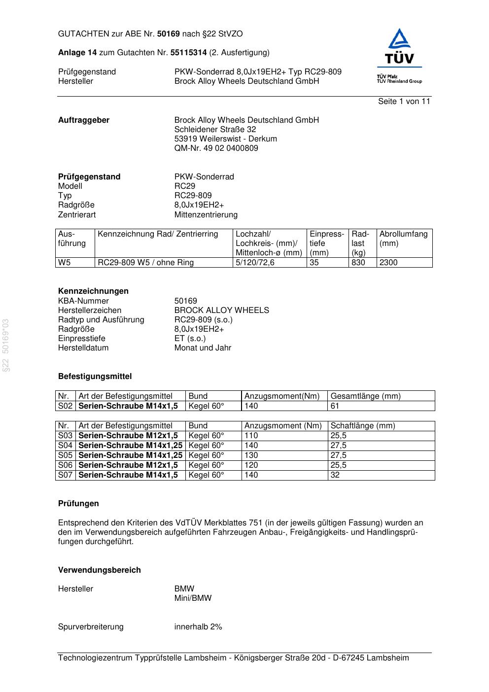Dieses Gutachten (abe) bezieht sich auf die Alufelge Brock RC29-8 09 in der Ausführung 8Jx19 ET 0, Mittenloch 0 mm (KBA 50169). Im PDF findest du typischerweise zulässige Reifengrößen, Auflagen/Anbauhinweise und – je nach Dokument – Hinweise zur Eintragung.