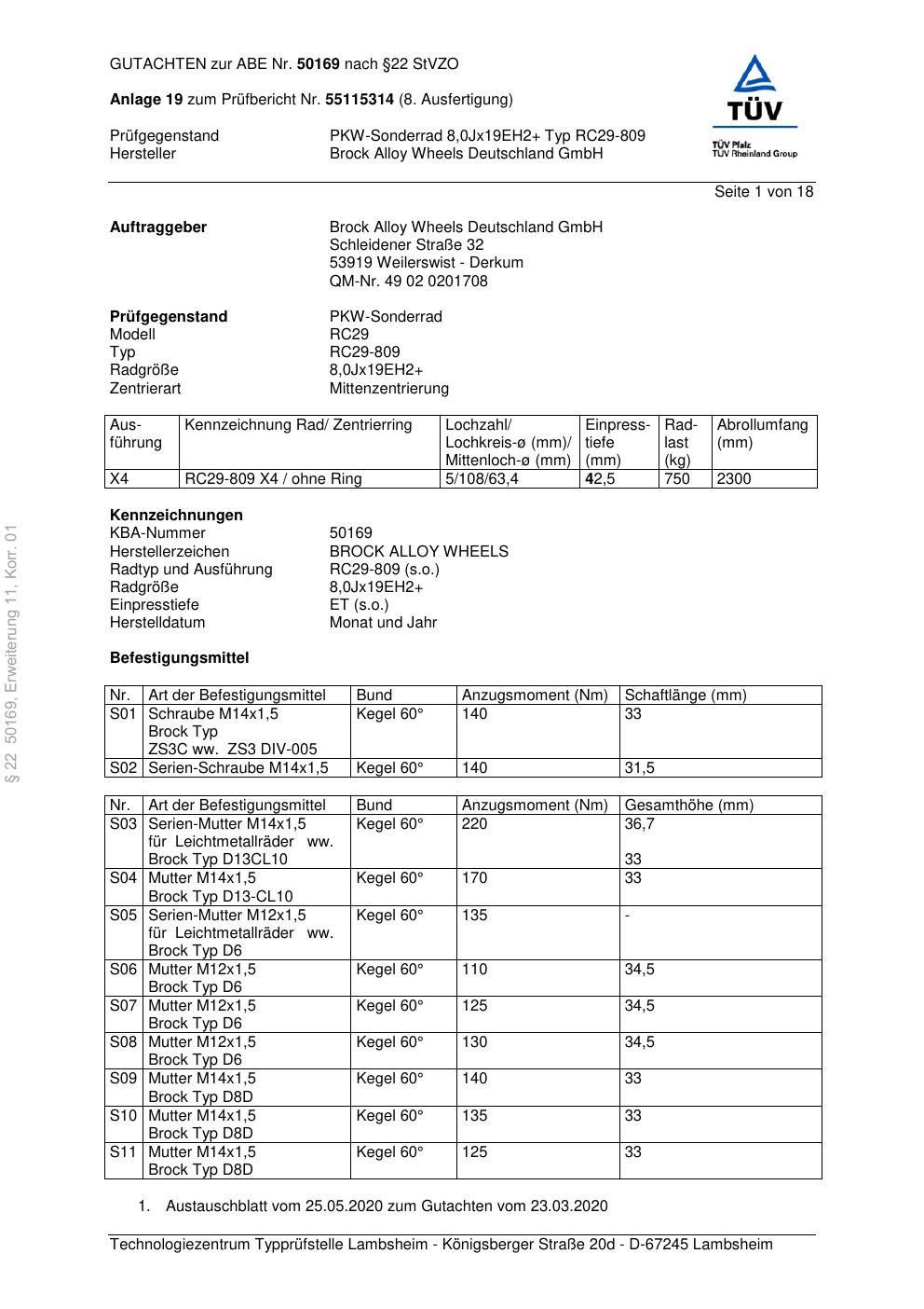 Dieses Gutachten (abe) bezieht sich auf die Alufelge Brock RC29-8 09 in der Ausführung 8.5Jx21 ET 0, Mittenloch 0 mm (KBA 50169). Im PDF findest du typischerweise zulässige Reifengrößen, Auflagen/Anbauhinweise und – je nach Dokument – Hinweise zur Eintragung.