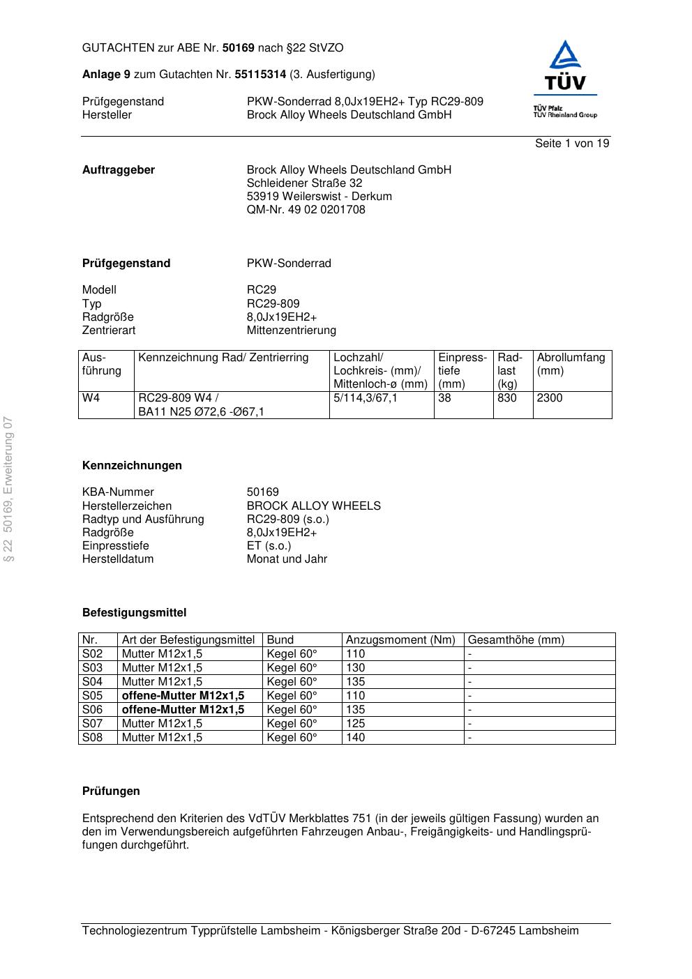 Dieses Gutachten (abe) bezieht sich auf die Alufelge Brock RC29-8 09 in der Ausführung ET 0, Mittenloch 0 mm (KBA 50169). Im PDF findest du typischerweise zulässige Reifengrößen, Auflagen/Anbauhinweise und – je nach Dokument – Hinweise zur Eintragung.