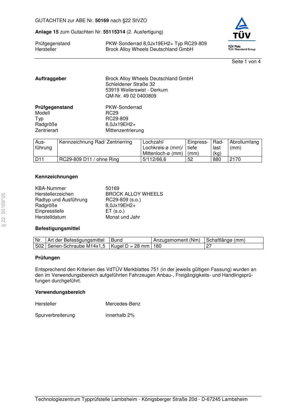 Dieses Gutachten (abe) bezieht sich auf die Alufelge Brock RC29-8 09 in der Ausführung ET 0, Mittenloch 0 mm (KBA 50169). Im PDF findest du typischerweise zulässige Reifengrößen, Auflagen/Anbauhinweise und – je nach Dokument – Hinweise zur Eintragung.