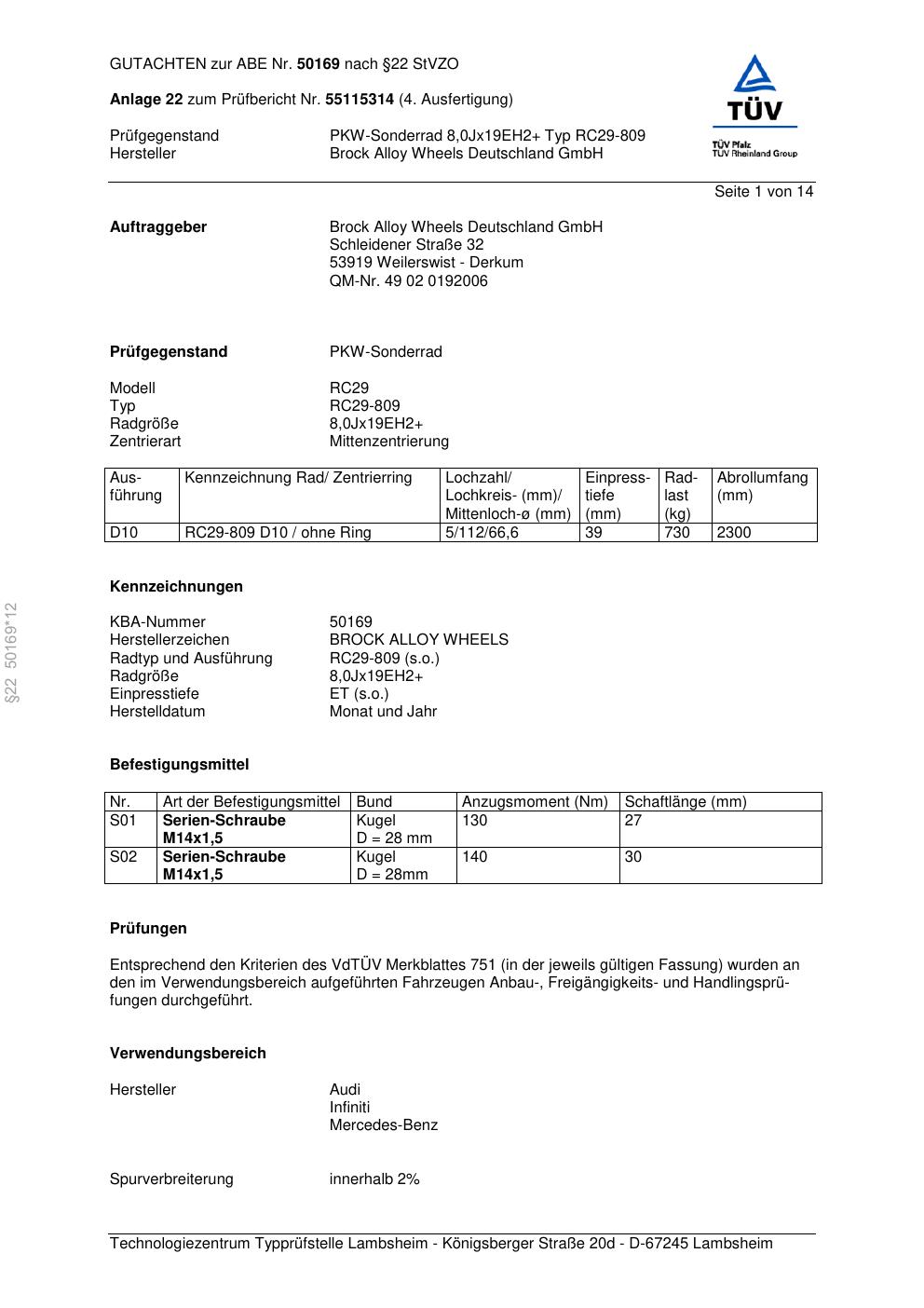 Dieses Gutachten (abe) bezieht sich auf die Alufelge Brock RC29-8 09 in der Ausführung ET 0, Mittenloch 0 mm (KBA 50169). Im PDF findest du typischerweise zulässige Reifengrößen, Auflagen/Anbauhinweise und – je nach Dokument – Hinweise zur Eintragung.