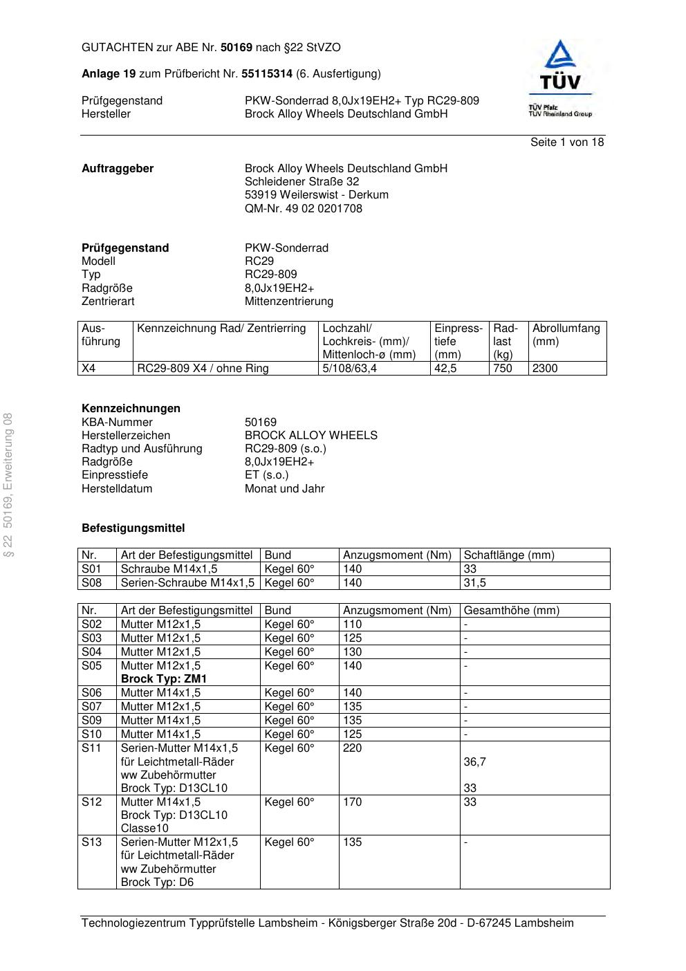 Dieses Gutachten (abe) bezieht sich auf die Alufelge Brock RC29-809 in der Ausführung ET 0, Mittenloch 0 mm (KBA 50169). Im PDF findest du typischerweise zulässige Reifengrößen, Auflagen/Anbauhinweise und – je nach Dokument – Hinweise zur Eintragung.