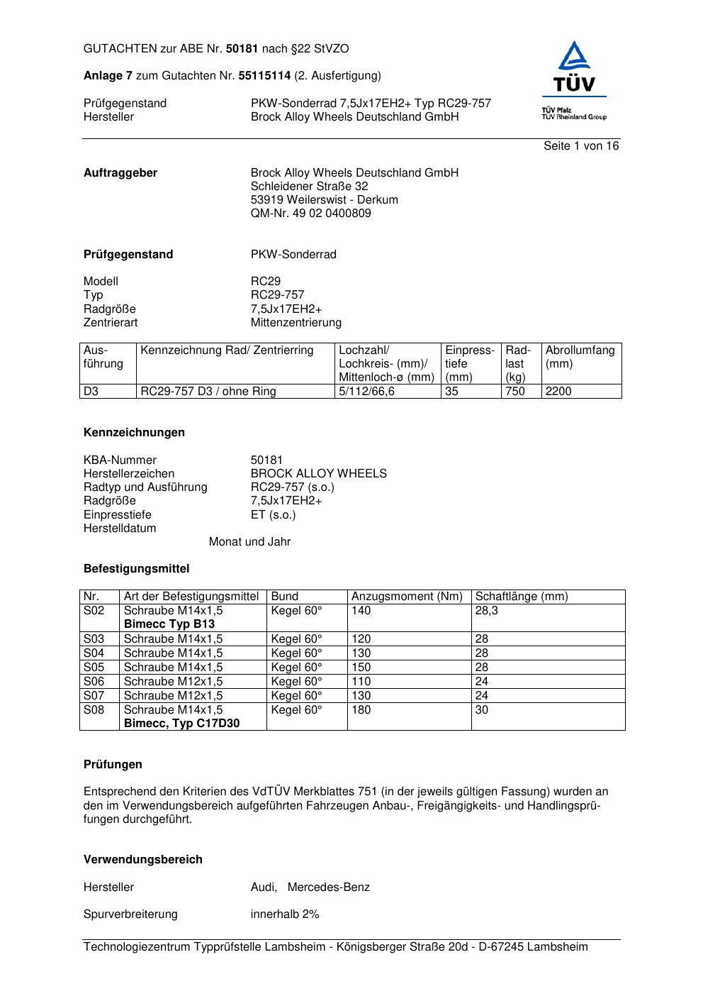 Dieses Gutachten (abe) bezieht sich auf die Alufelge Brock RC29-7 57 in der Ausführung 7.5Jx17 ET 0, Mittenloch 0 mm (KBA 50181). Im PDF findest du typischerweise zulässige Reifengrößen, Auflagen/Anbauhinweise und – je nach Dokument – Hinweise zur Eintragung.