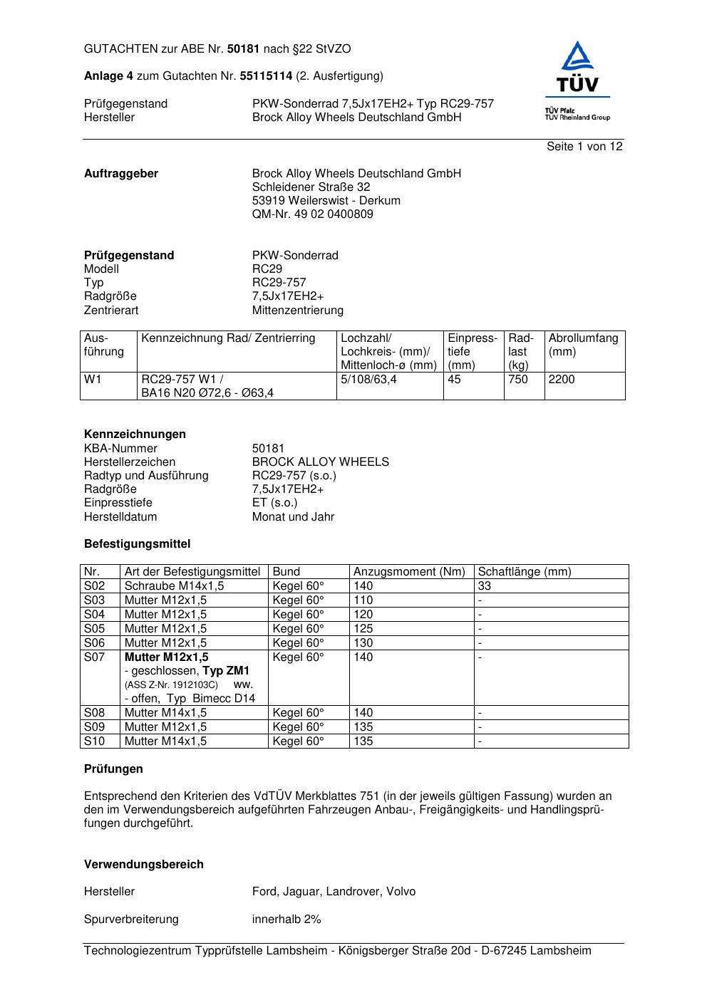 Dieses Gutachten (abe) bezieht sich auf die Alufelge Brock RC29-7 57 in der Ausführung 7.5Jx17 ET 0, Mittenloch 0 mm (KBA 50181). Im PDF findest du typischerweise zulässige Reifengrößen, Auflagen/Anbauhinweise und – je nach Dokument – Hinweise zur Eintragung.