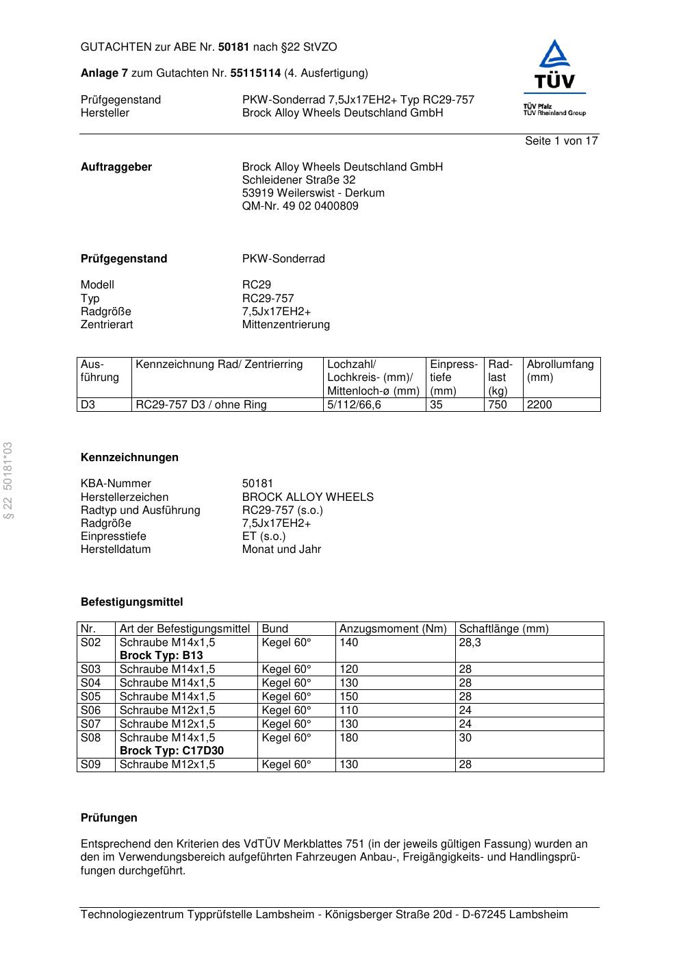 Dieses Gutachten (abe) bezieht sich auf die Alufelge Brock RC29-7 57 in der Ausführung ET 0, Mittenloch 0 mm (KBA 50181). Im PDF findest du typischerweise zulässige Reifengrößen, Auflagen/Anbauhinweise und – je nach Dokument – Hinweise zur Eintragung.