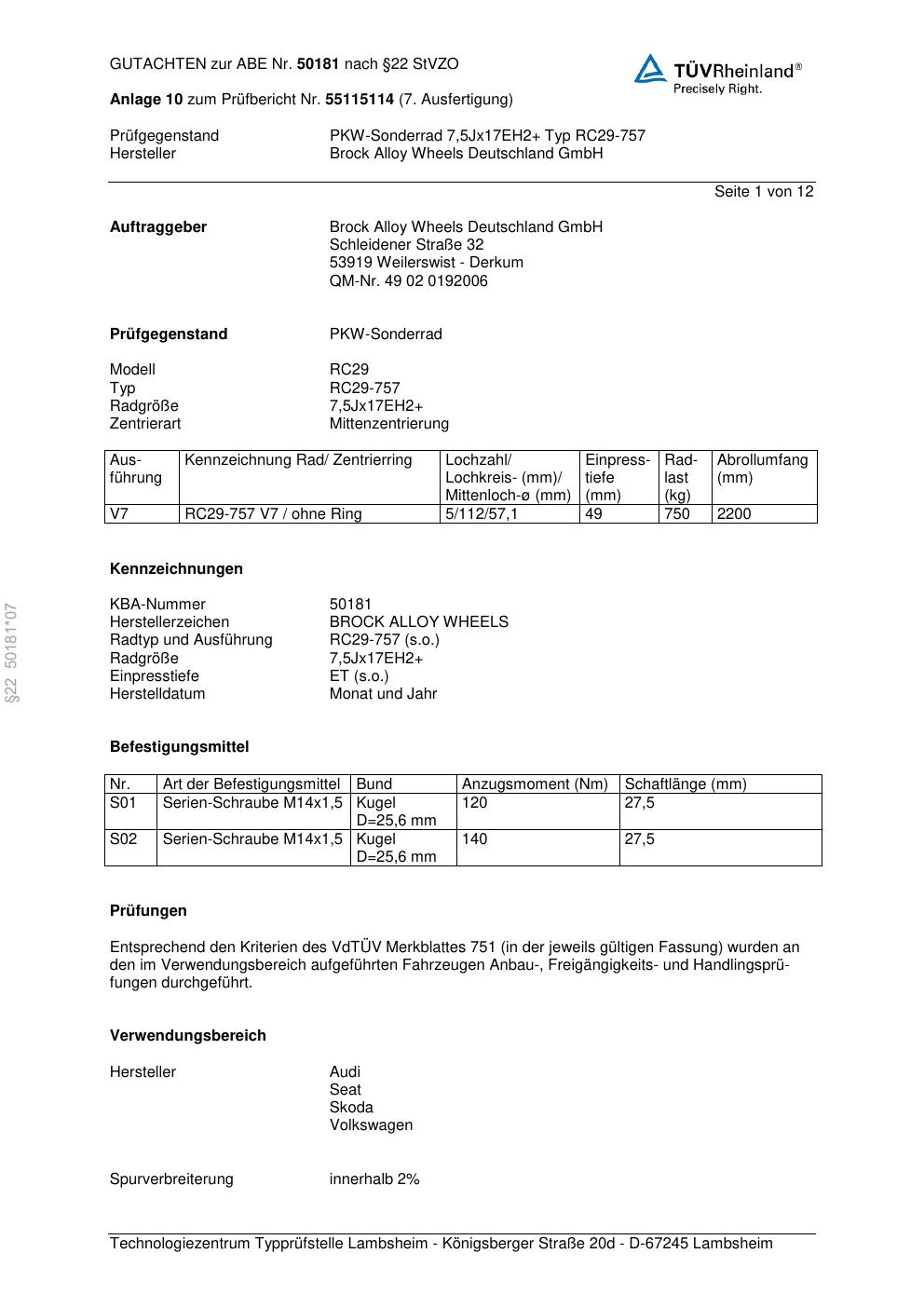 Dieses Gutachten (abe) bezieht sich auf die Alufelge Brock RC29-7 57 in der Ausführung ET 0, Mittenloch 0 mm (KBA 50181). Im PDF findest du typischerweise zulässige Reifengrößen, Auflagen/Anbauhinweise und – je nach Dokument – Hinweise zur Eintragung.