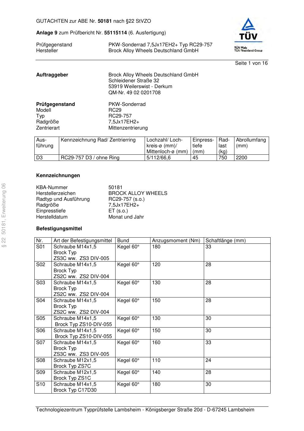 Dieses Gutachten (abe) bezieht sich auf die Alufelge Brock RC29-757 in der Ausführung ET 0, Mittenloch 0 mm (KBA 50181). Im PDF findest du typischerweise zulässige Reifengrößen, Auflagen/Anbauhinweise und – je nach Dokument – Hinweise zur Eintragung.
